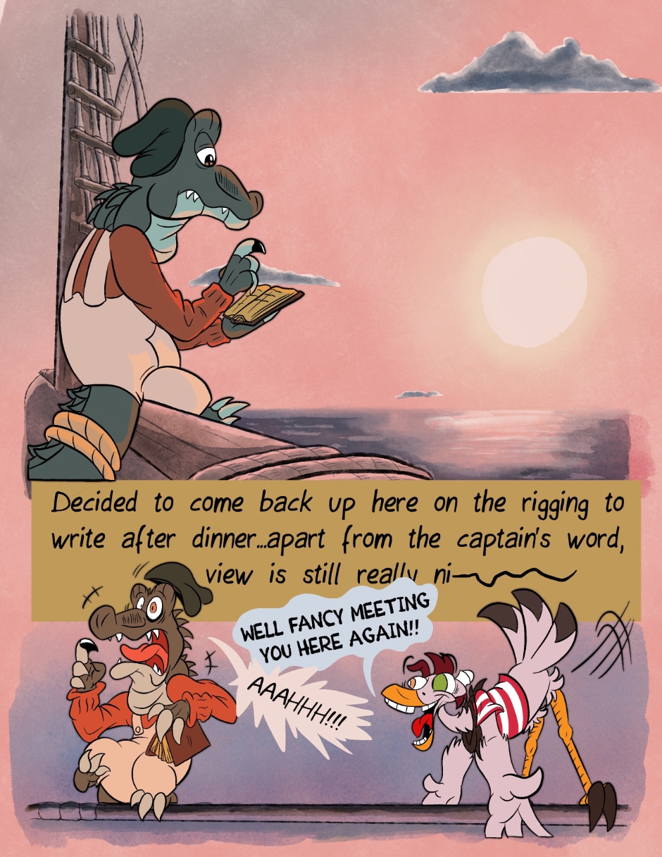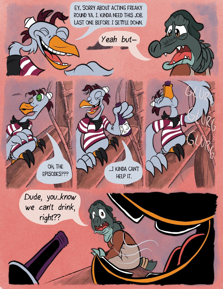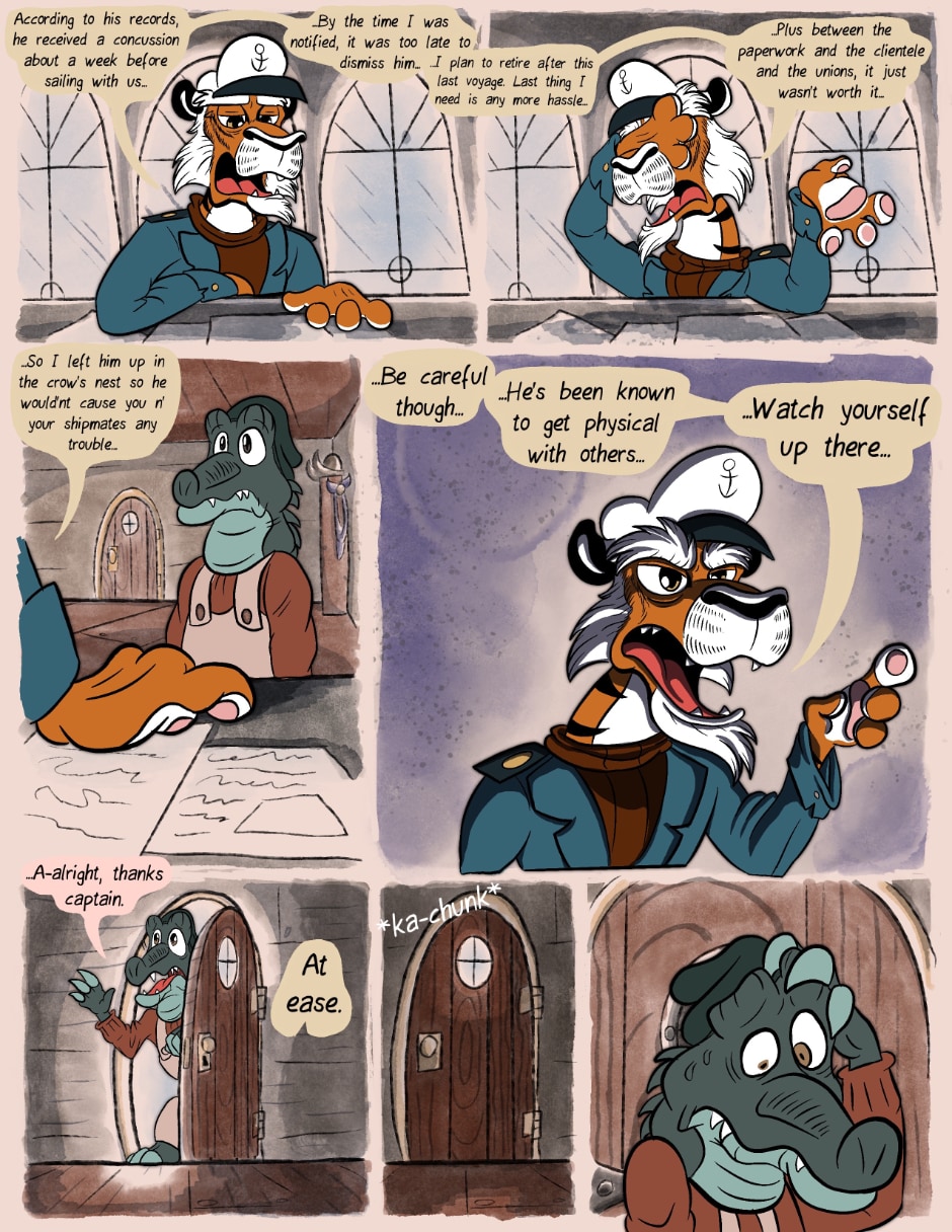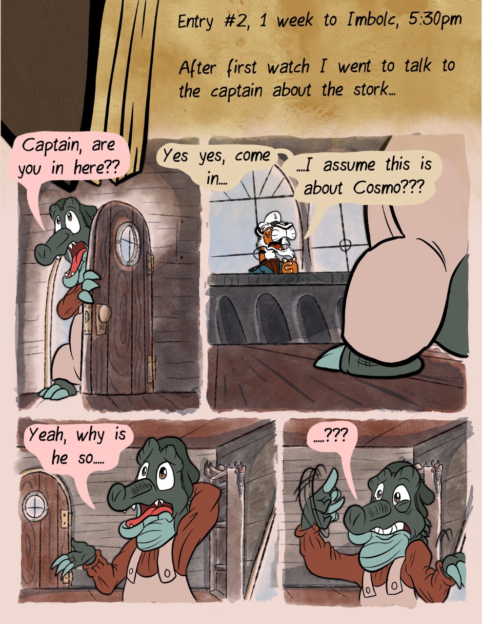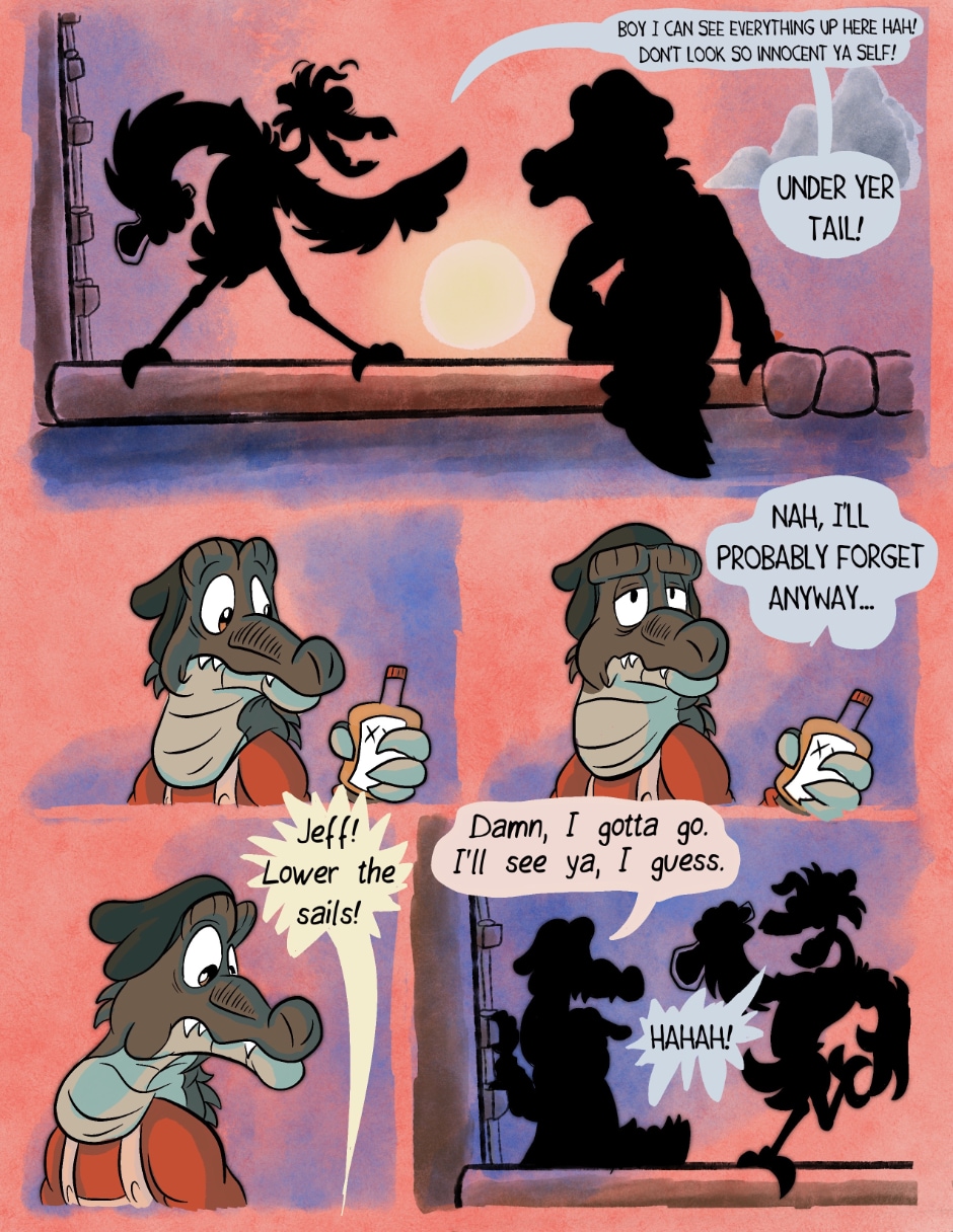 Okay, I'm still loving this, but there is a little confusion with the text here. Is the new Captain planning on retiring or is he going to retire Cosmo? You have a grammer error there that really subtracts from what is being said. Also, what happen to the bottle that Jeff had?