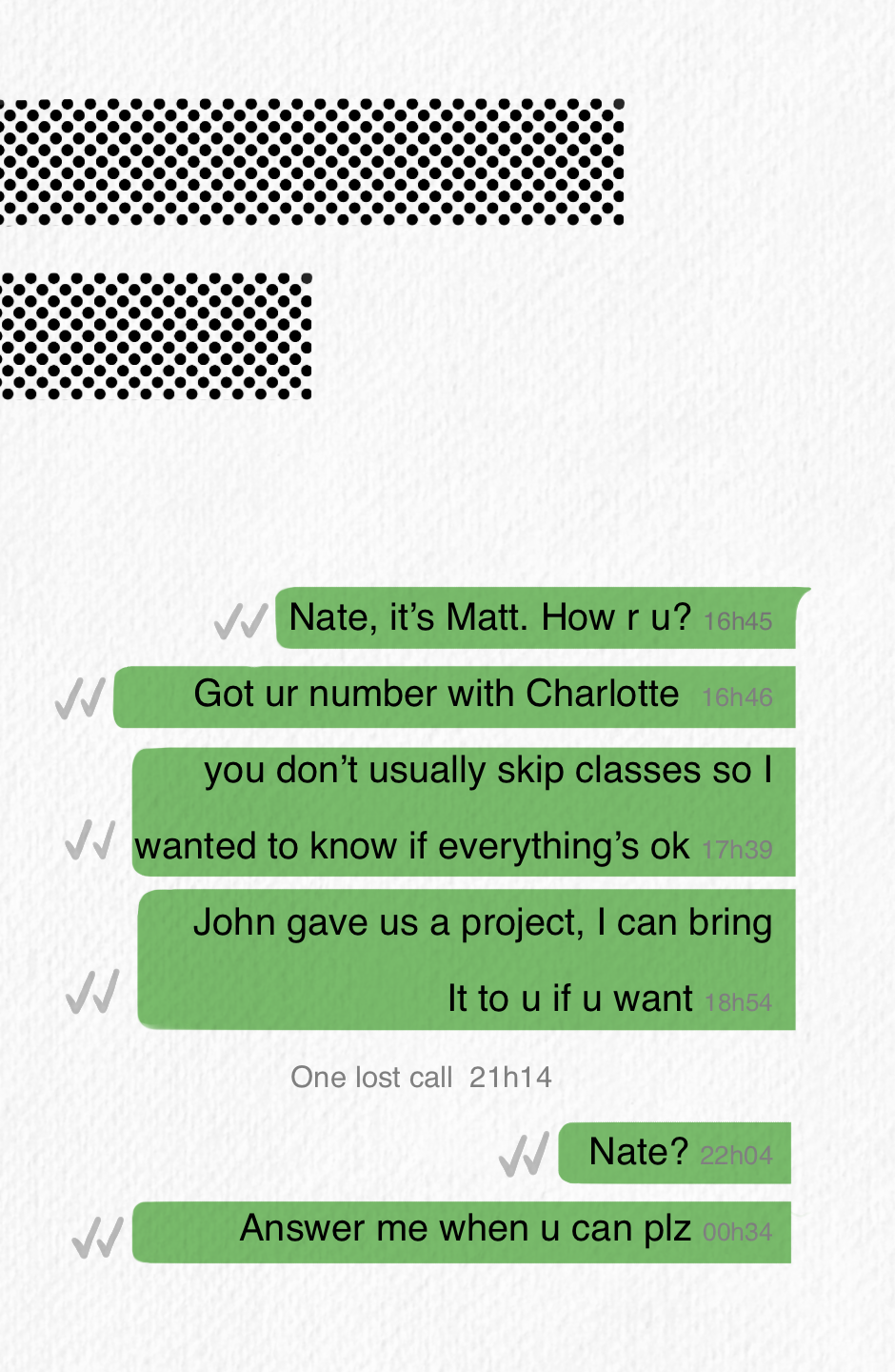 "I want you to know that I undestand you, so you can trust me. I'll never judge you. I'm telling you all of that because we grew up together, I know for sure you don't deserve all this pain"