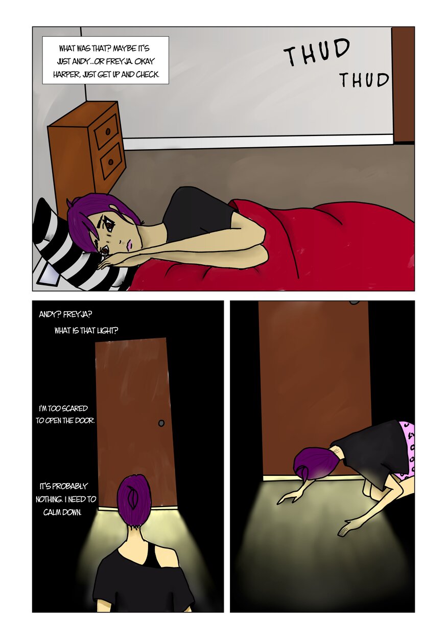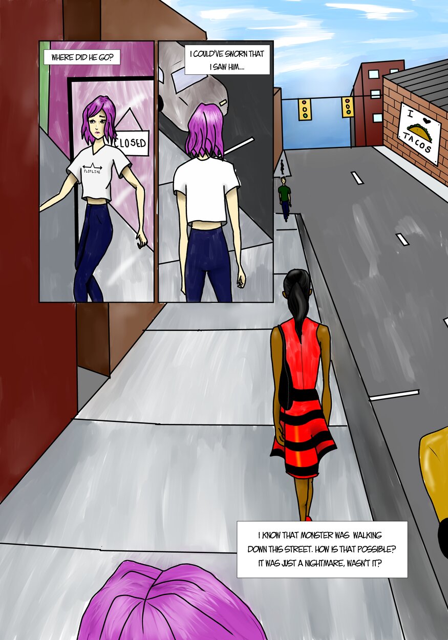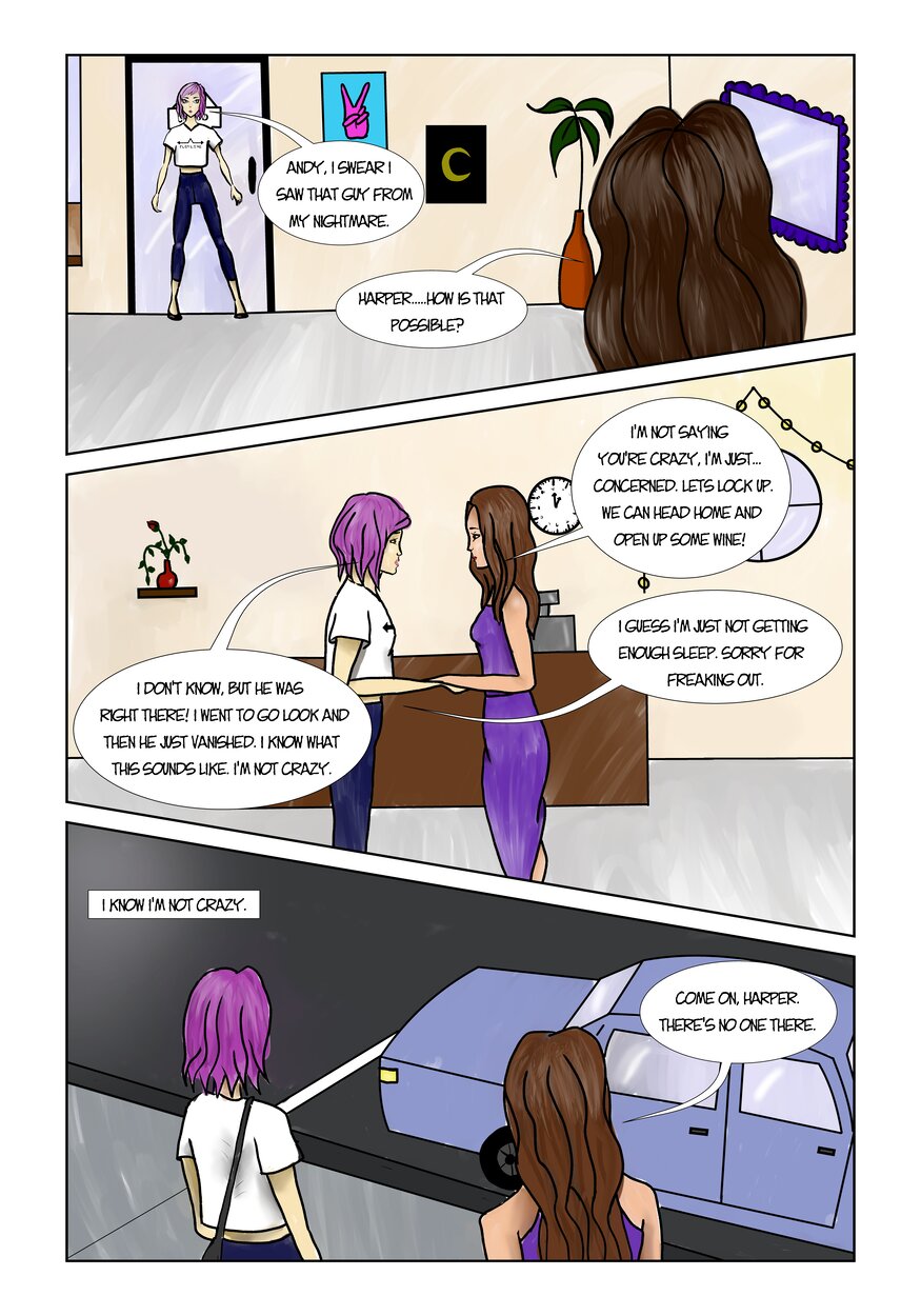 Plot Line is a comic about the main character, Harper, a 25 year old who works in a vintage shop with the owner and roommate, Andy. Harper begins to have nightmares about a man, a little girl, and a house where terrible things are happening. After seeing the same man from her nightmare outside the shop one day, Harper goes into a spiral of trying solve the mystery of the nightmares she's been having. In this dark hole, Harper runs into a mysterious figure who is somehow involved and does not want Harper to get in her way. Harper will soon have to figure out how far she's willing to go to find the truth, no matter how dark it is.