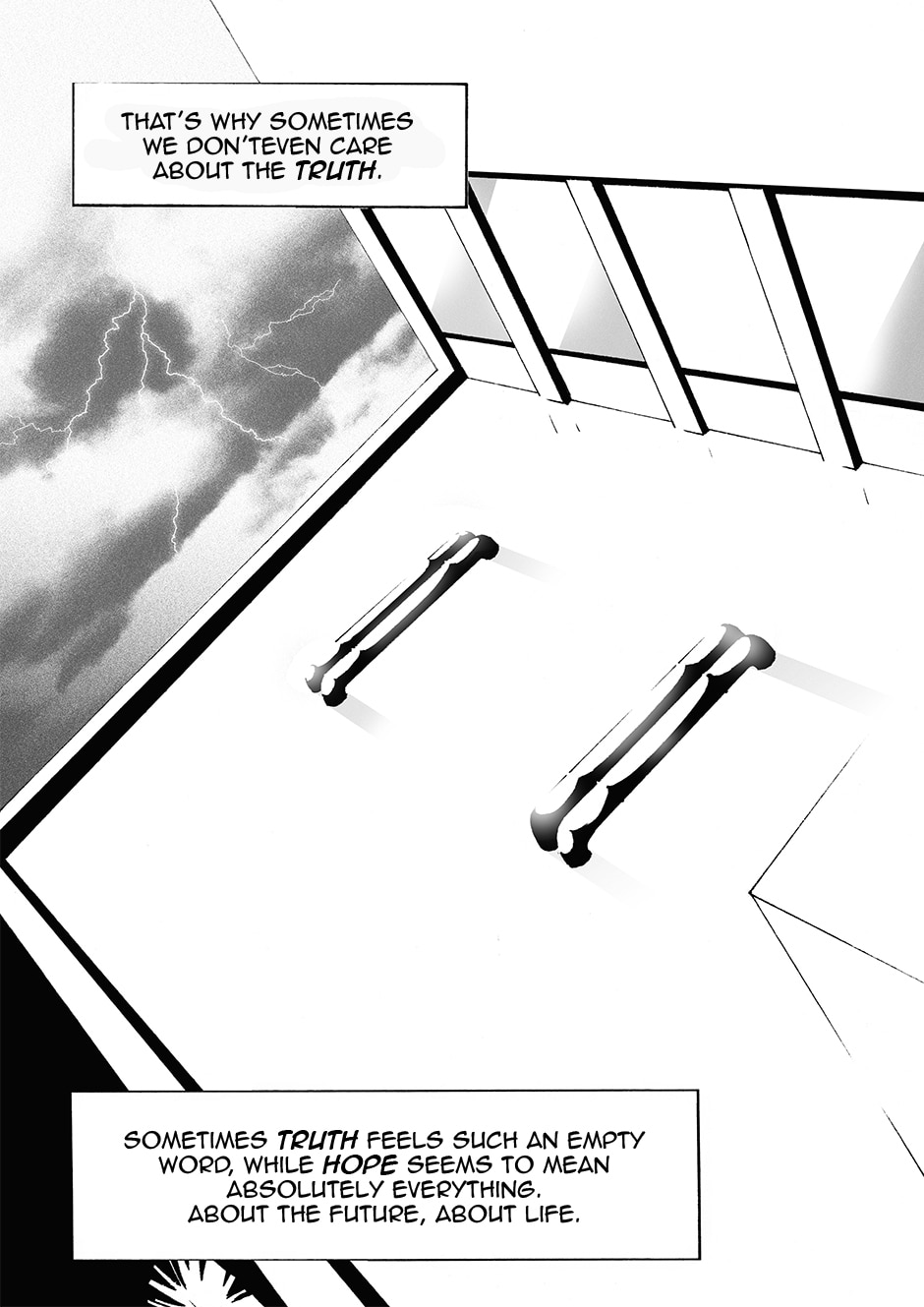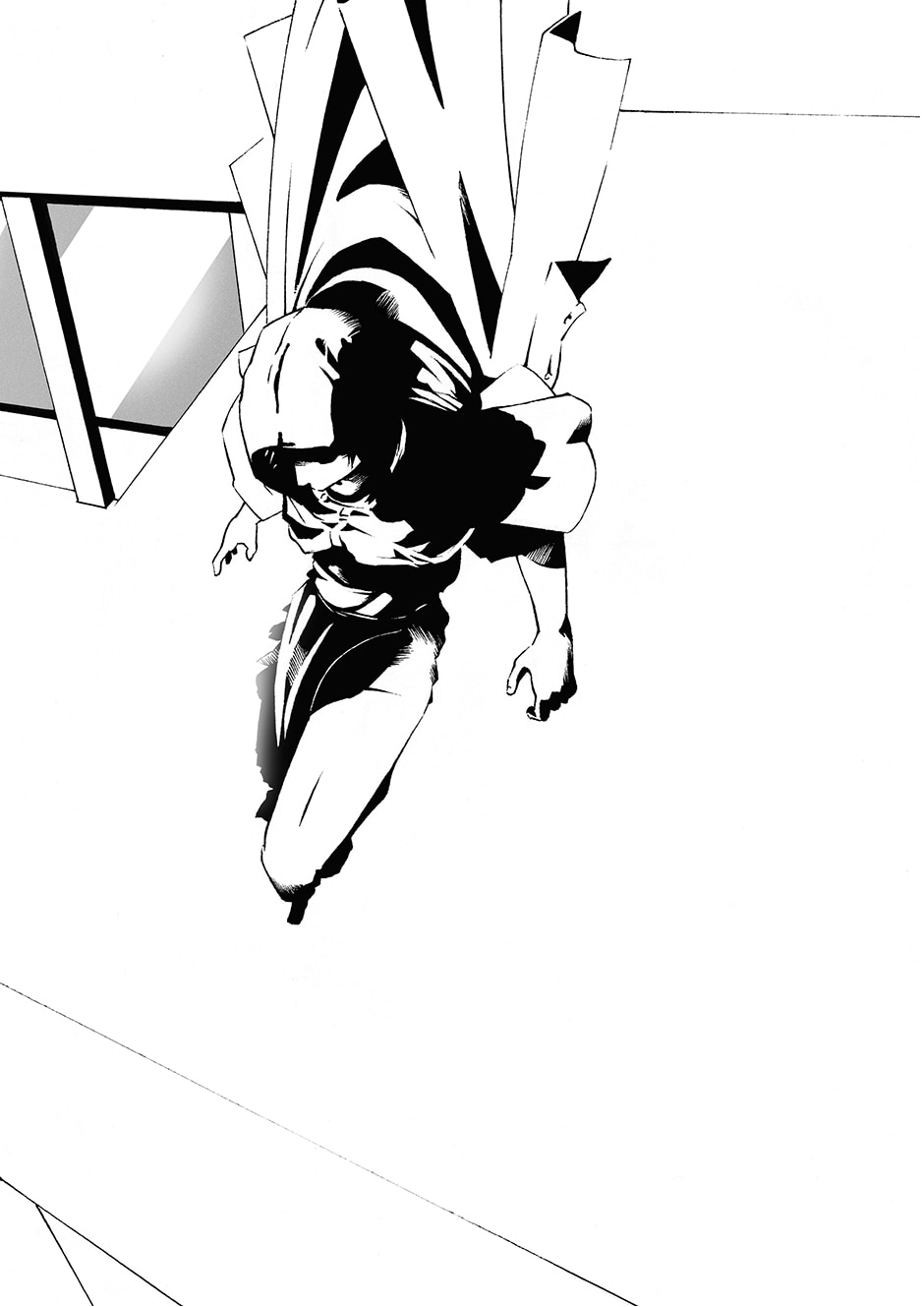 (Turn on the music) Did someone notice the reflection in the puddle on the previous page? It was him.