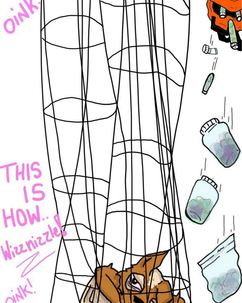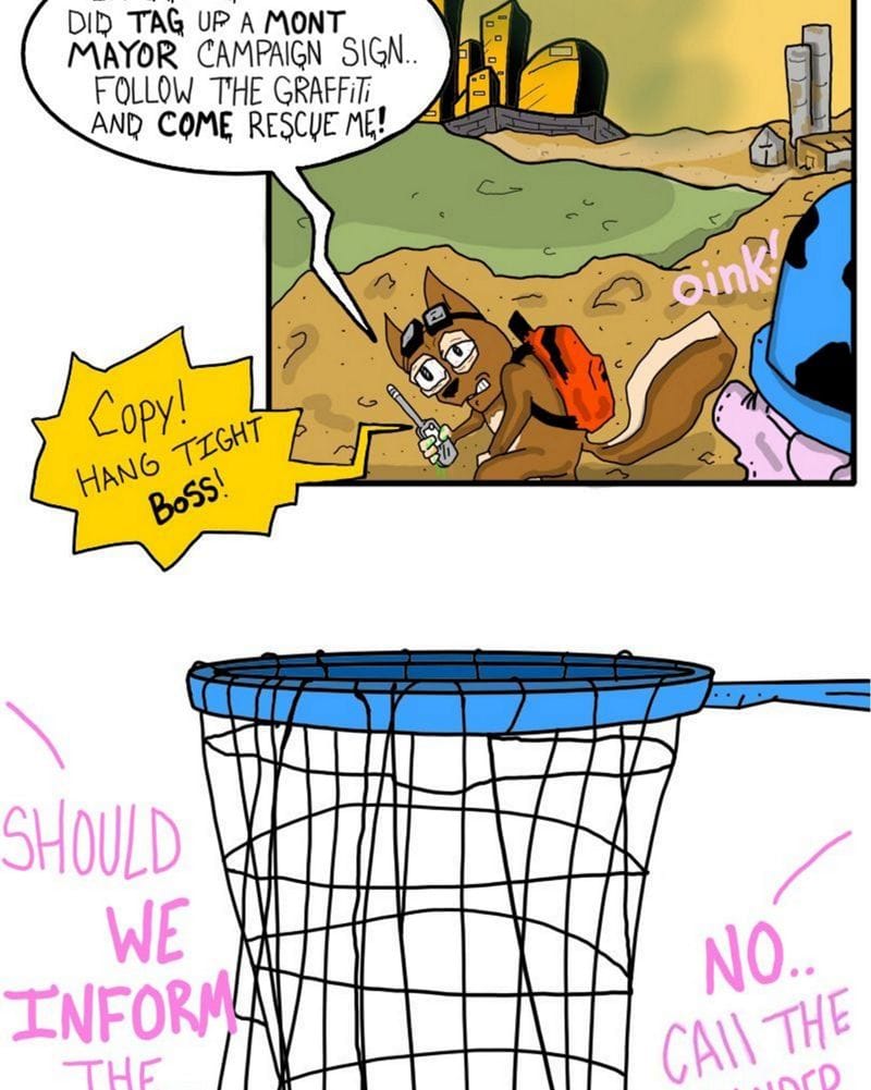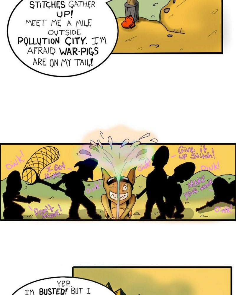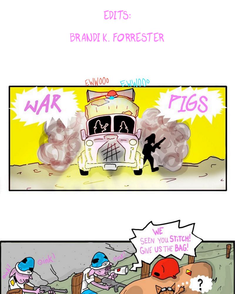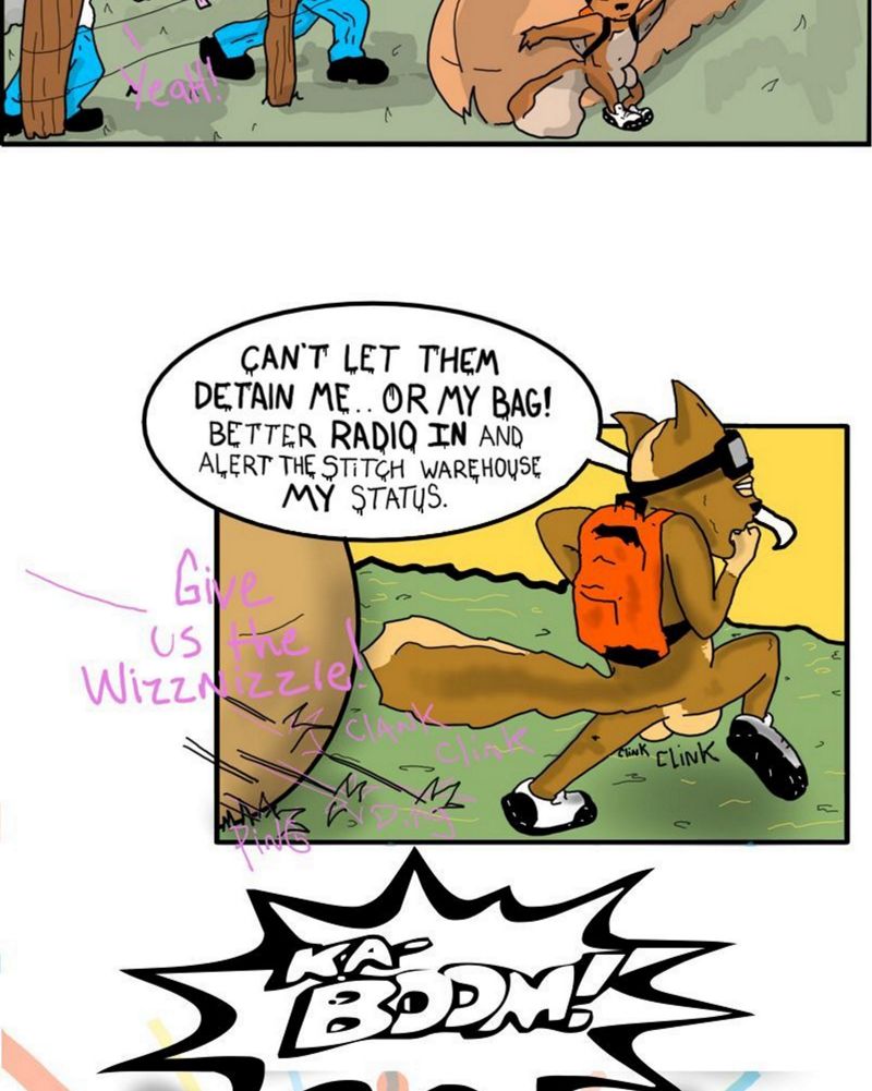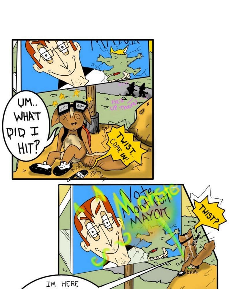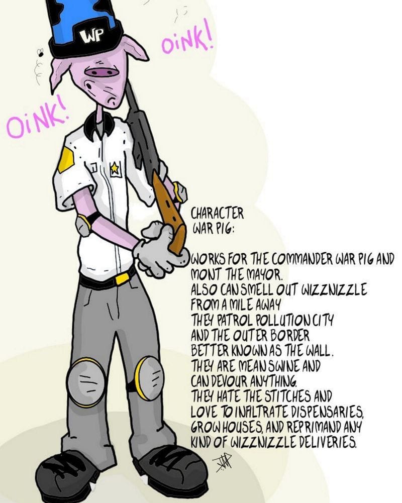 After being spotted by the the War-Pigs, twist makes way and tries to run. His bag filled with WizzNizzle is priority #1 but he can't help to stop gratifying his nemesis's campaign advertisements by shaking his canisters and aiming his spray nozzle.