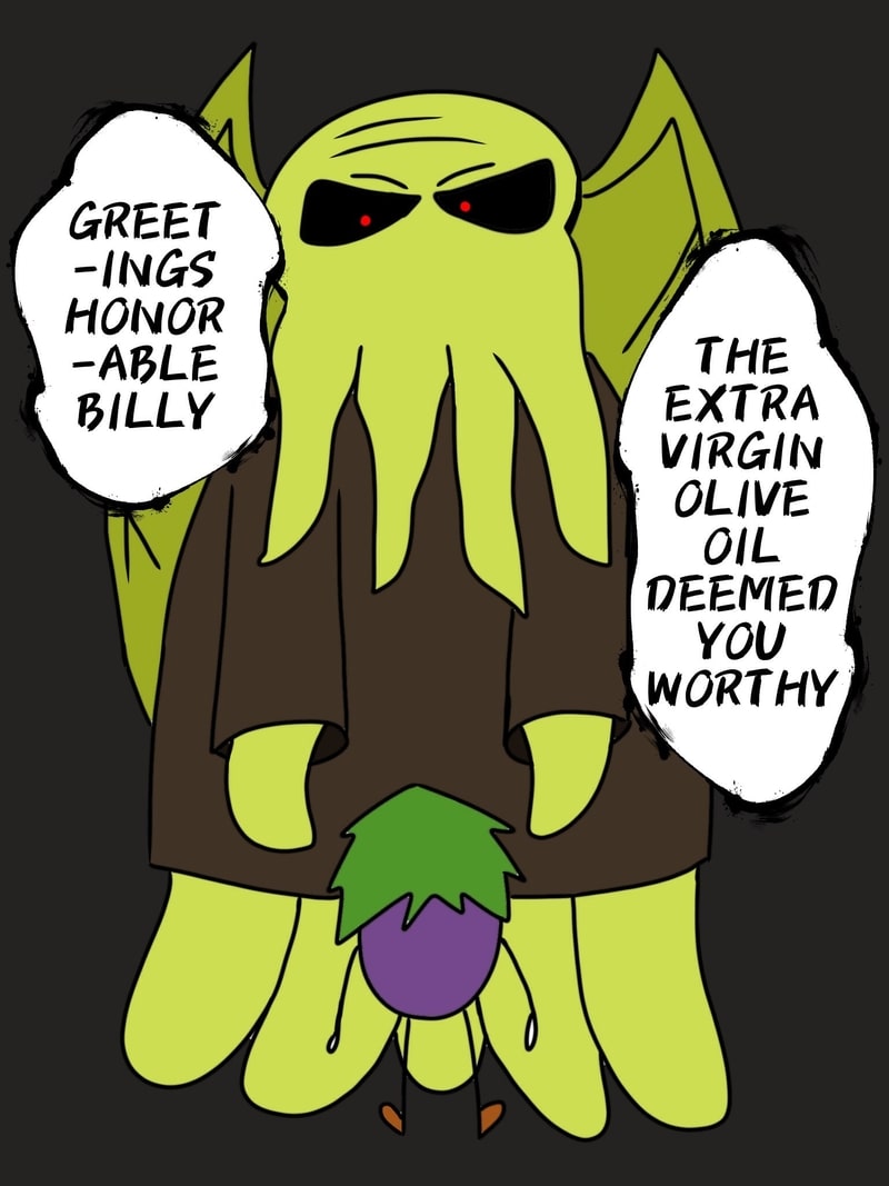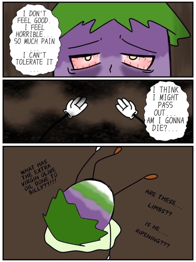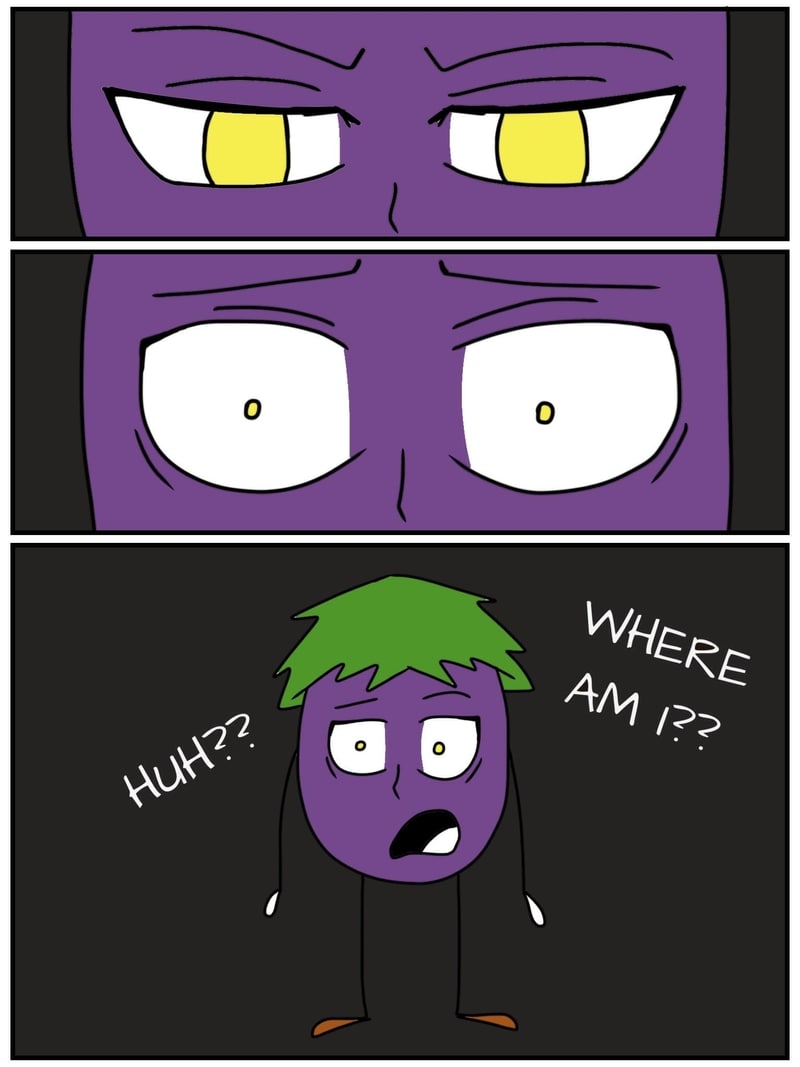 Long ago, his whole eggplant village was murdered by the "Riley Farm" Clan; they were famous for killing all kinds of innocent veggies. This eggplant was the only one to survive because he wasn't ripe. He heard his brothers' and sisters' screams. Now, he's out for human juice...