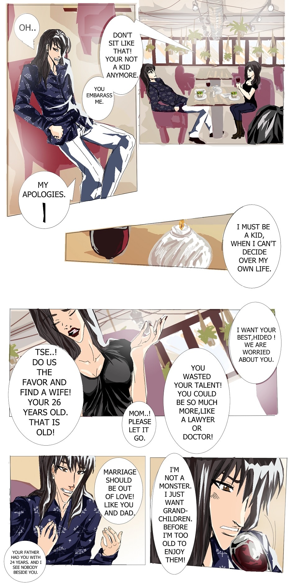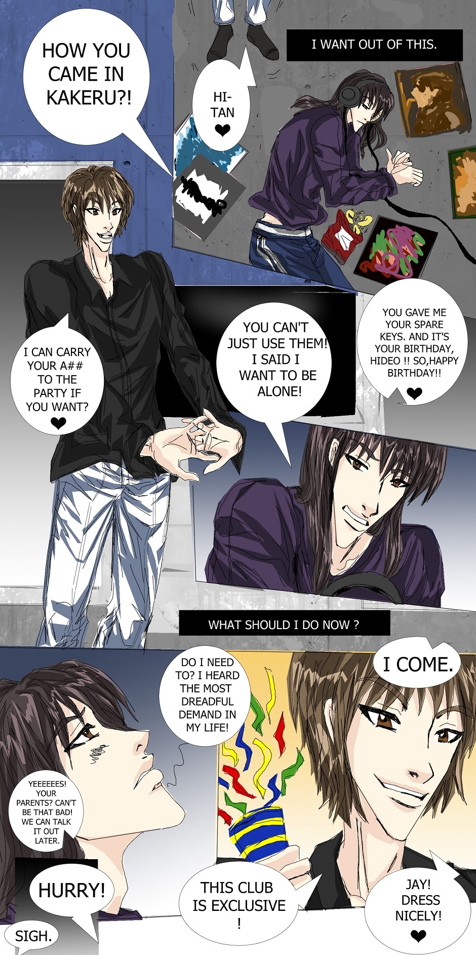 ( Read from right to left ) Hideo ,kid of the upper class meets survival artist Aki-chan and forgets all around him ,but for how long can their Love sustain ? There a lot of couples in the Story.
