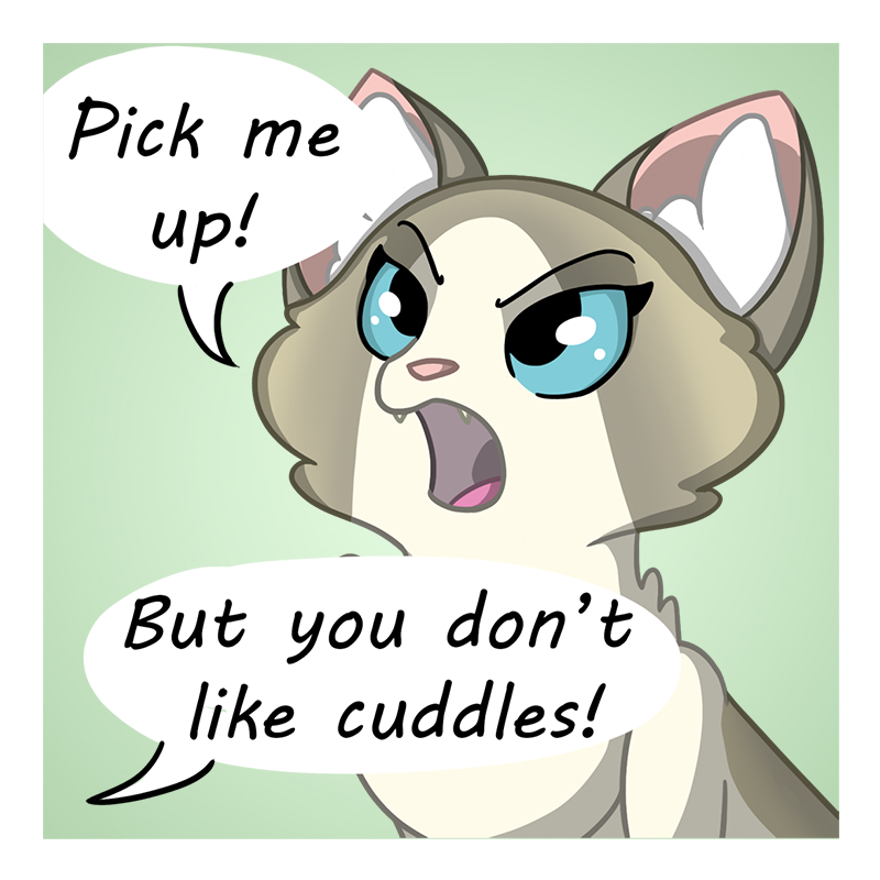 What does your pet think of cuddles? Sweety always screams to be picked up, and then when I do she takes a moment to think about her existential existence, before suddenly wanting to be put down again.