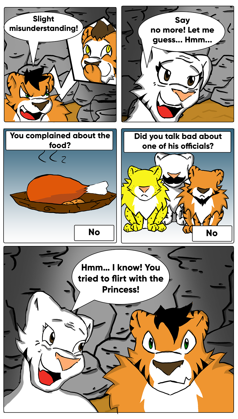 The royal soldier finished his mission without knowing what happened. The king, very satisfied with the armies' success, invited Rock Master to dinner at the palace. This General didn't think that the soul of Barbacat and his obsession for women would take control of his body at the sight of the king's daughter. Everyone was furious when Barbacat, in Rock Master's body, tried to kiss the princess. This meant exile for the lion.