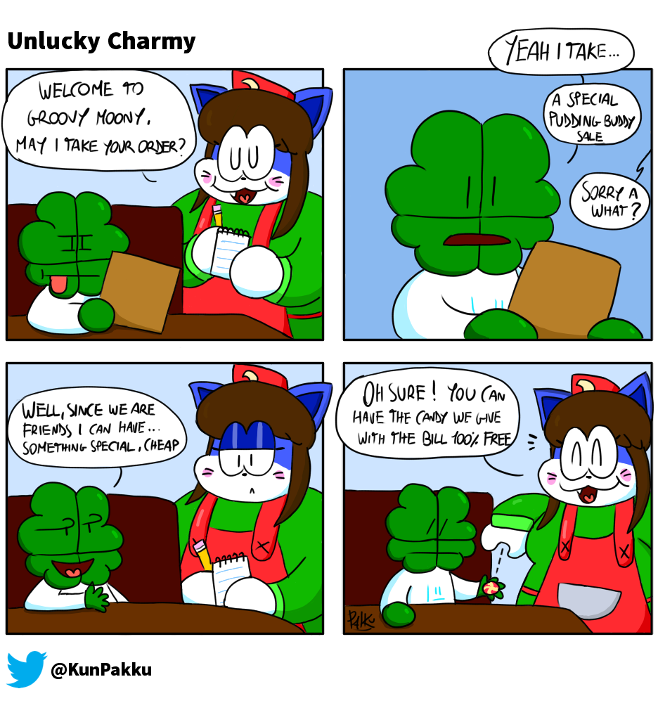 Charmy is a 4 leaf clover that gets on wacky misadventures with his friends: Dex and Ombra, two partners in crime solving, Gumboad, a lil' hedgehog that lives his life with his big family, Sally, an overweight cat that works in a diner and Hotdog man, the super hero of Funkytown.