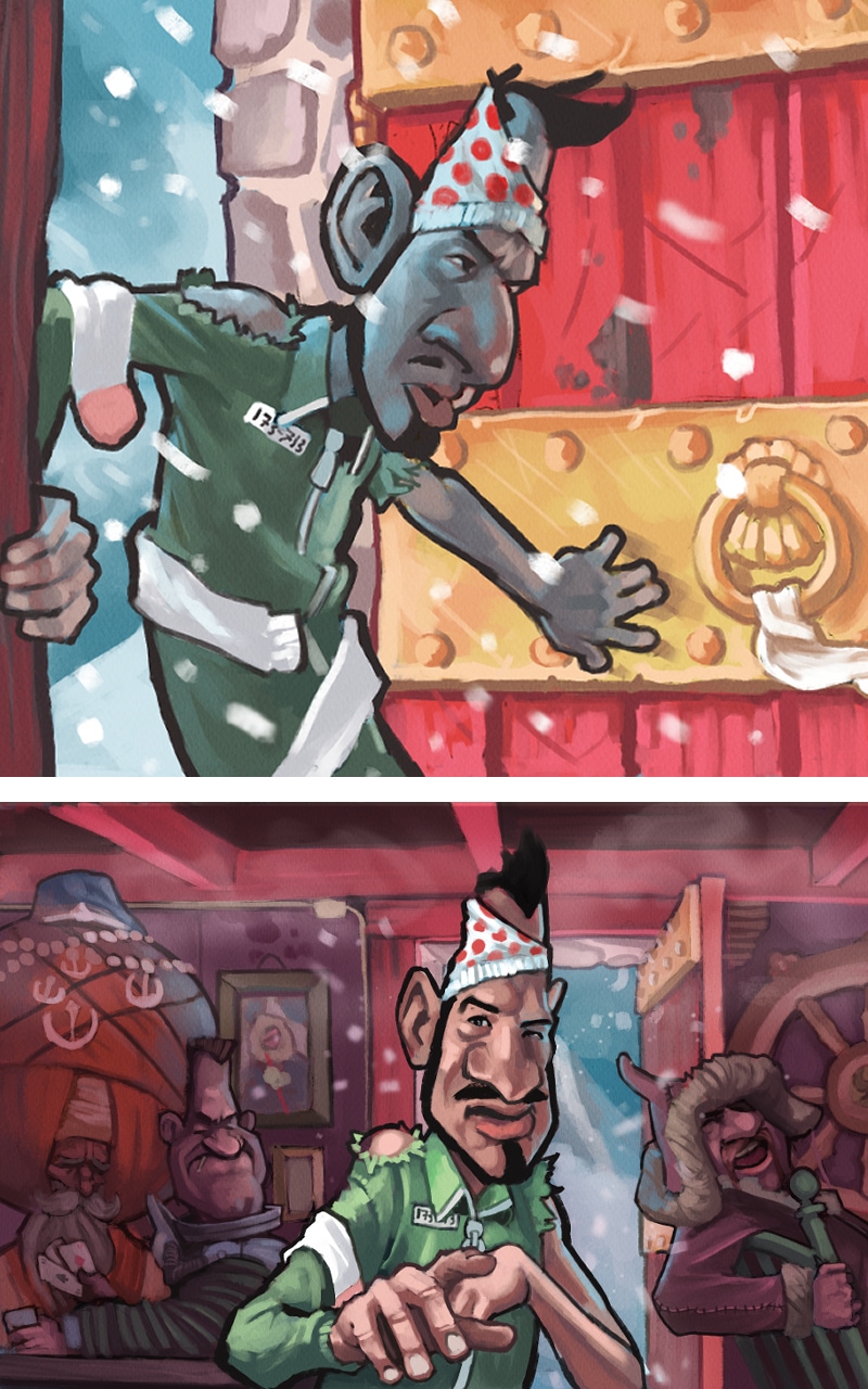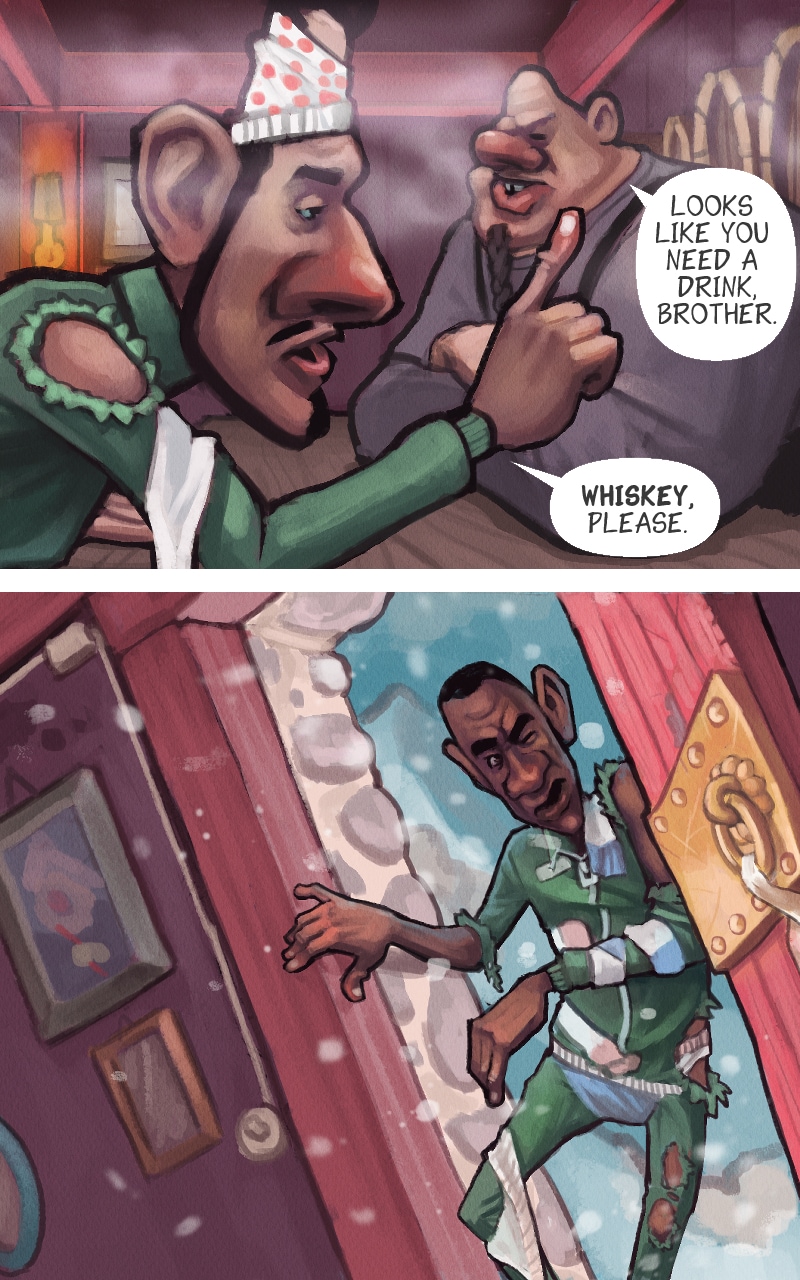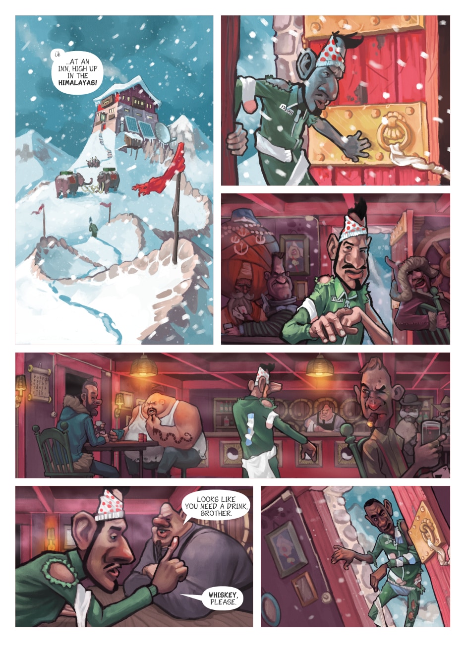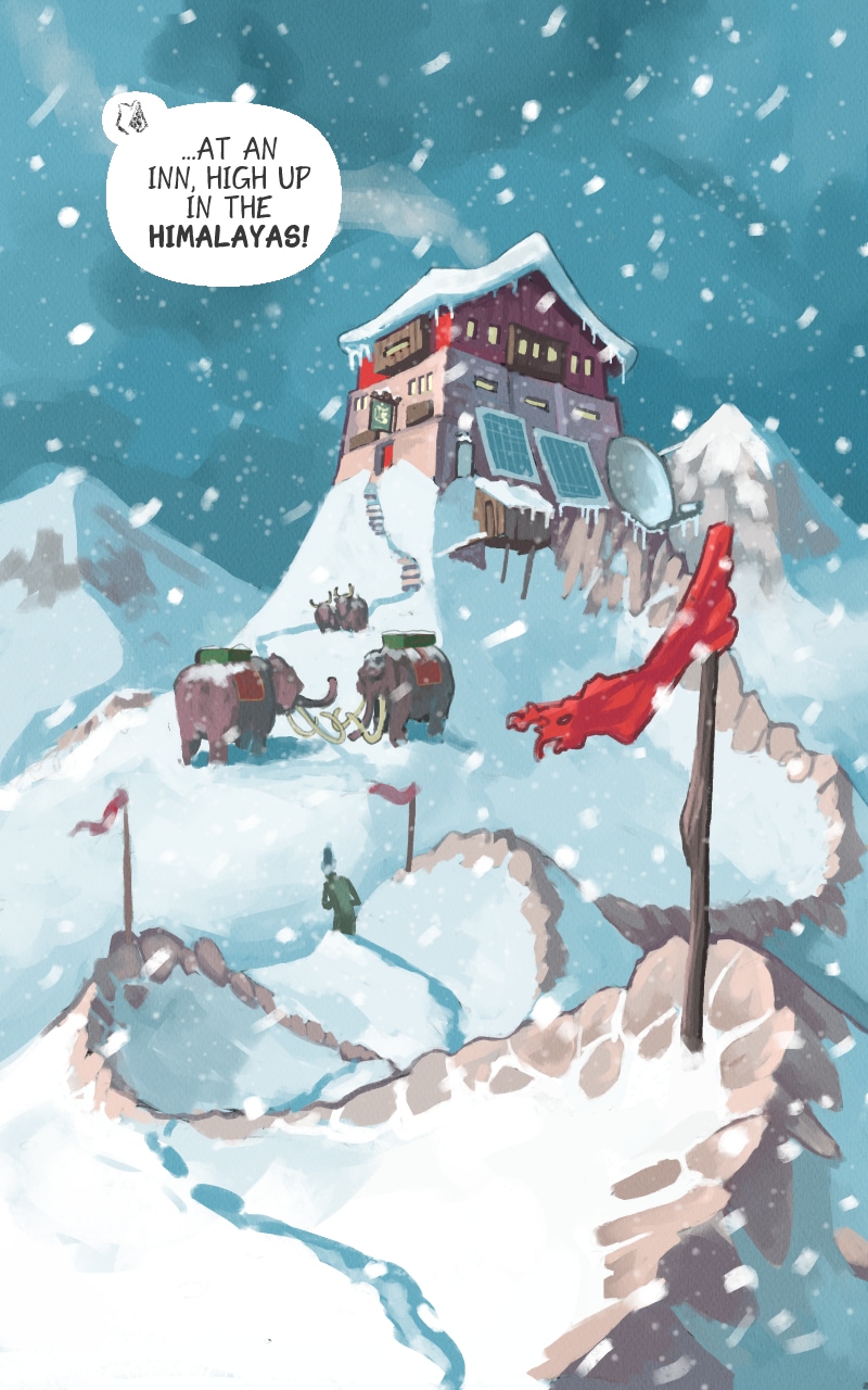 Now we take a leap from the dry dessert to the frosty mountain ranges of Himalaya! Our heroes are wearing raggedy clothes, covered in undies. Strange...