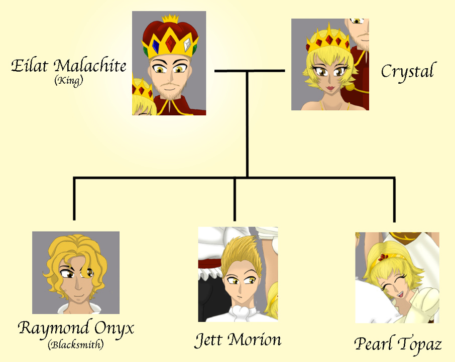 The not-so-complete family tree of the rubies. In this royal family, each child must be named after a jewel. Crystal was chosen from other women to be King Eilat's bride, she was mainly pick because of her name.