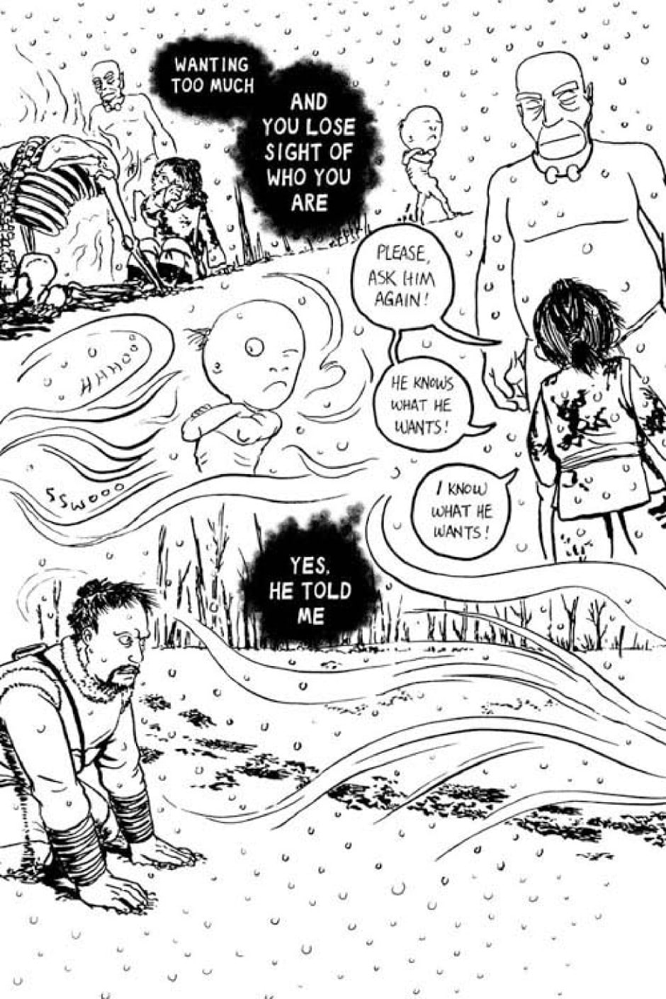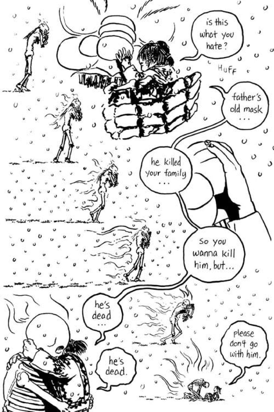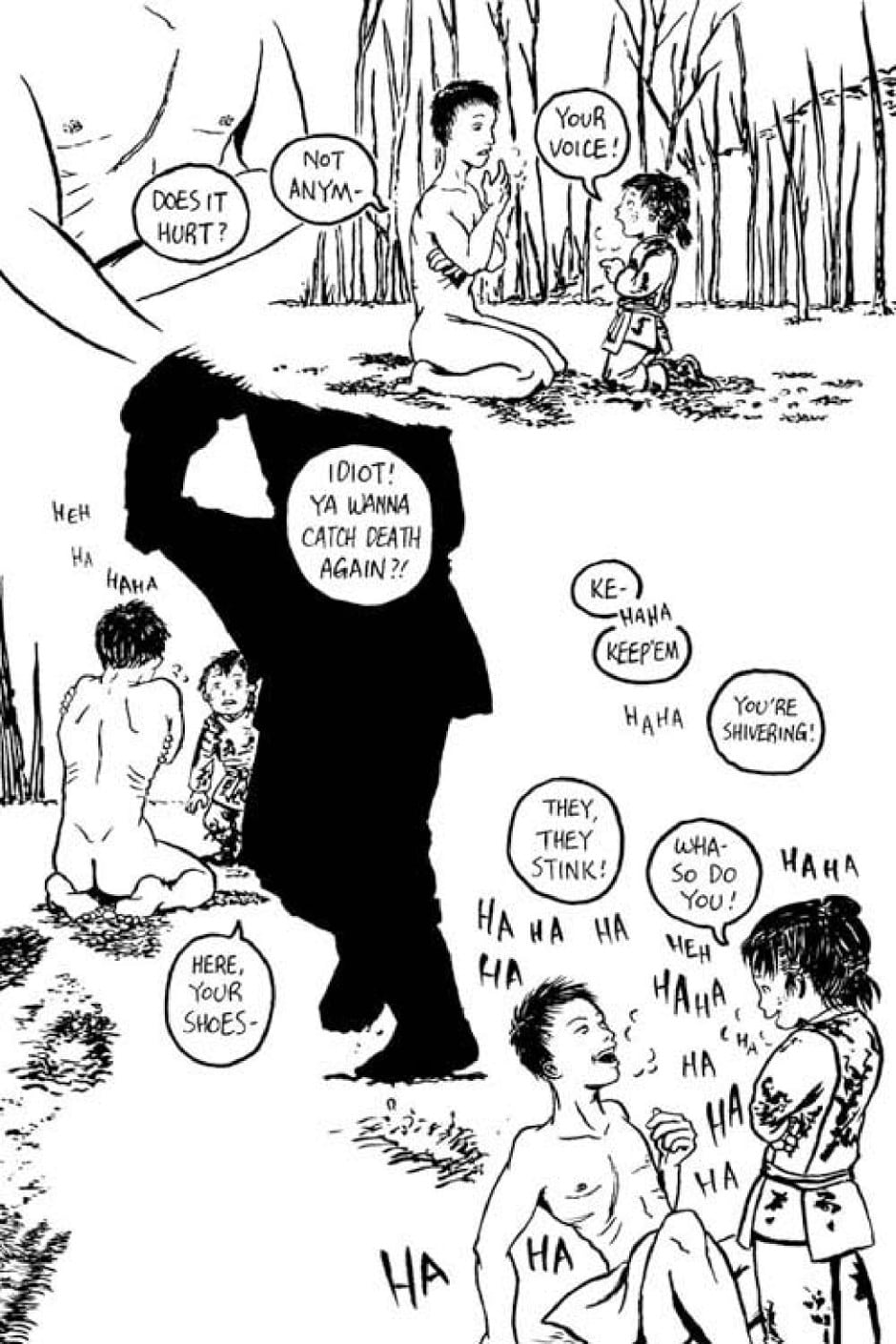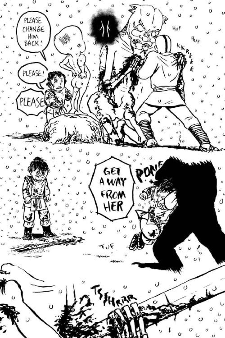 * (page 164) When I found out that third singular "it" in Chinese used to refer to snake, I tacked on a word for "eye" to it and that became Tamu's name as well as his design. As for what's going on with the "chemical wash" and the transformation, interpret it how you wish.