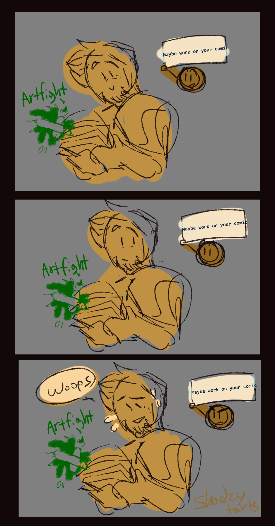 Update: Good news: started getting into digital art again And started a bit of a multiple post comic (I still need to finish it) (Not really) Bad news: Art fight started and I had to start making Oc references instead of working on my comics So I might be kinda slow with updating for the rest of this month and next month, I have p spontaneous energy so like, hi, hello if you want me to be more active I'm more active on Instagram (My name's Shadzytarts on Insta and Artfight) Still slow on Insta but like, I post a lil more there I'll do my best with updating though, thank you for the patience!