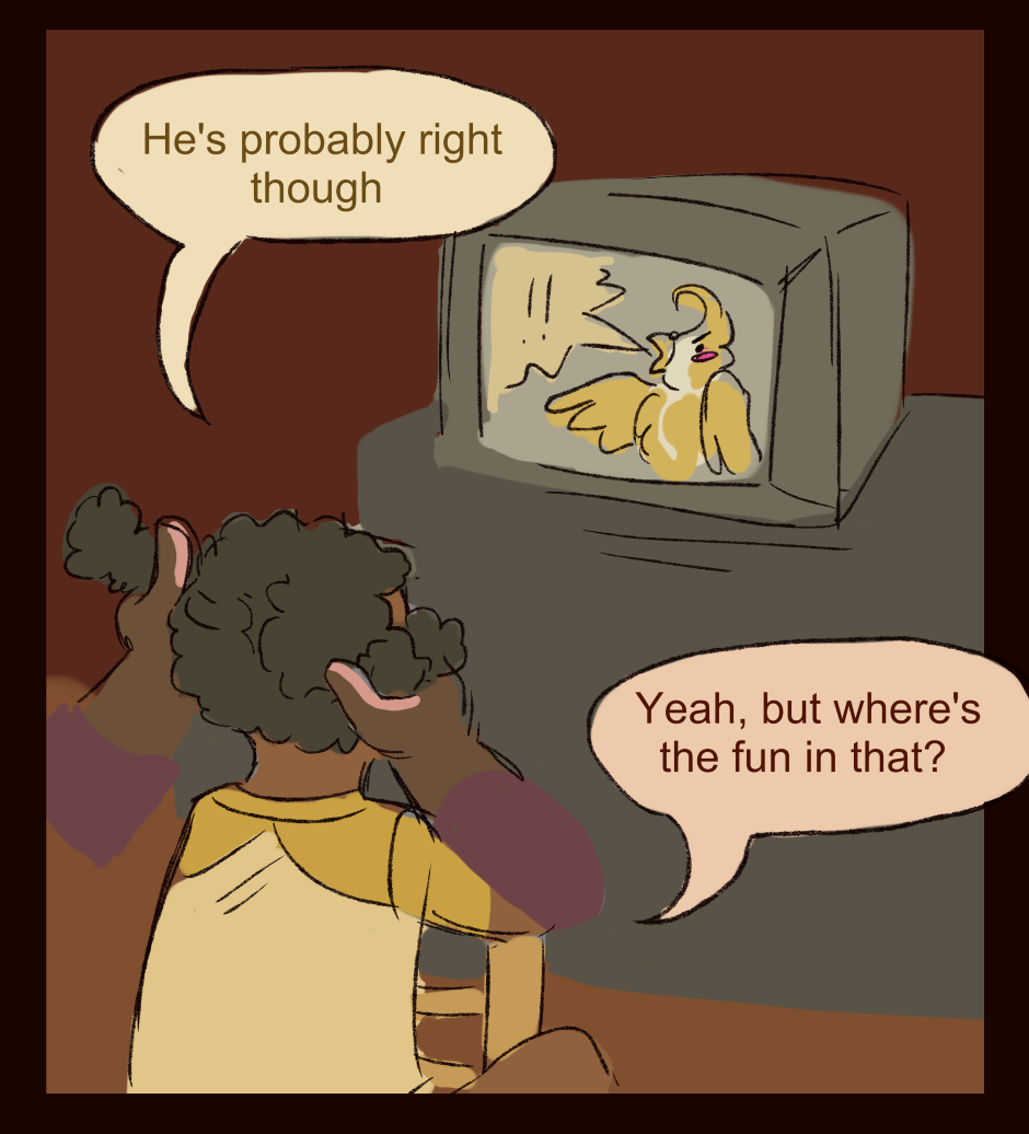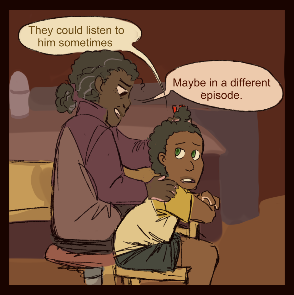Eli caring for Akiza's hair while they watch TV set in Oxmond (Life in Oxmond)