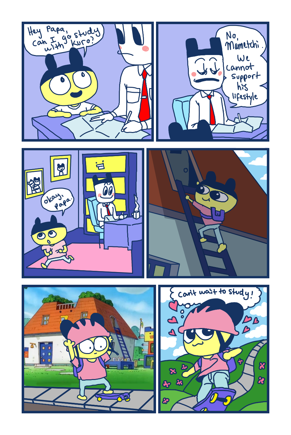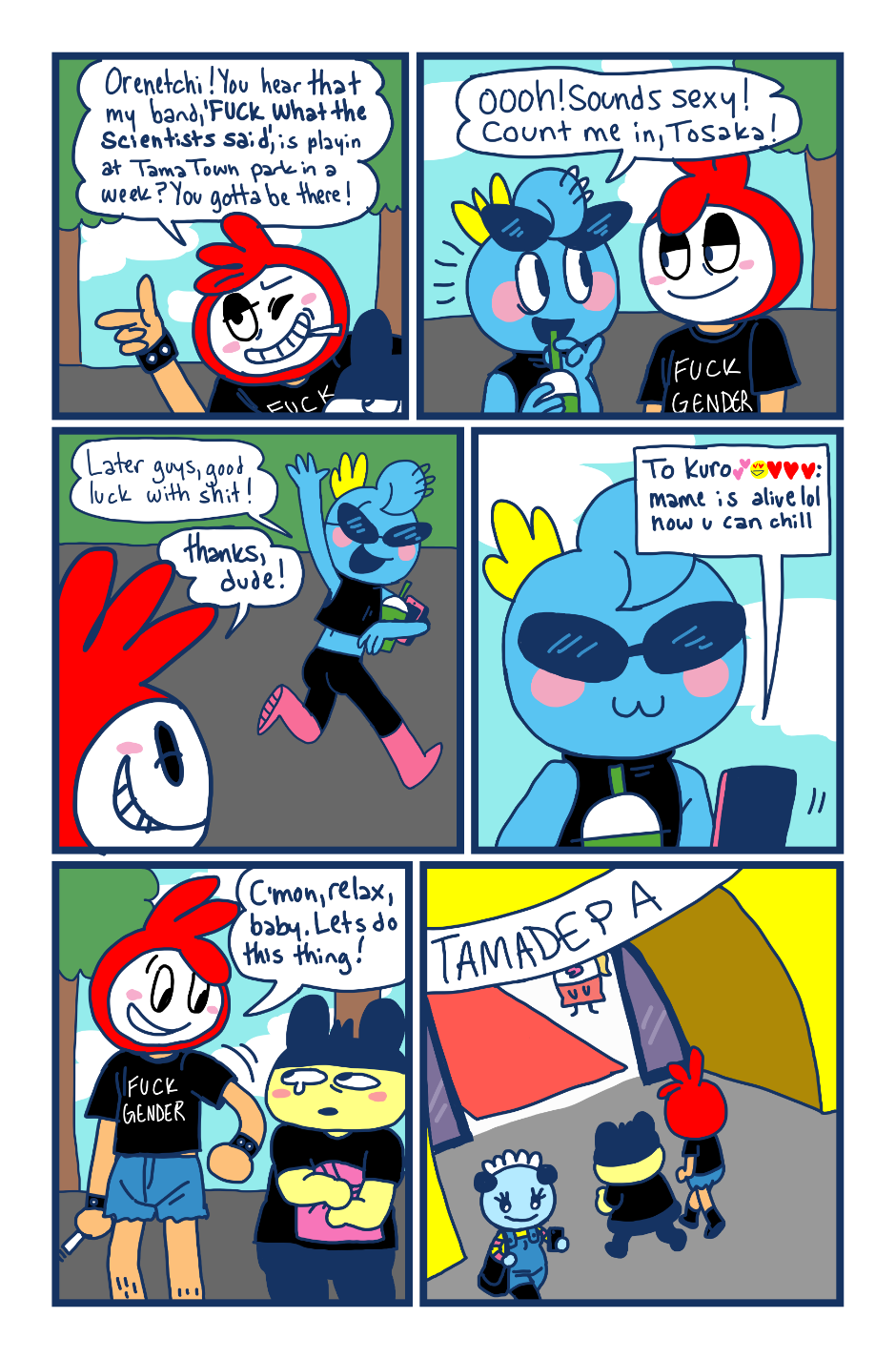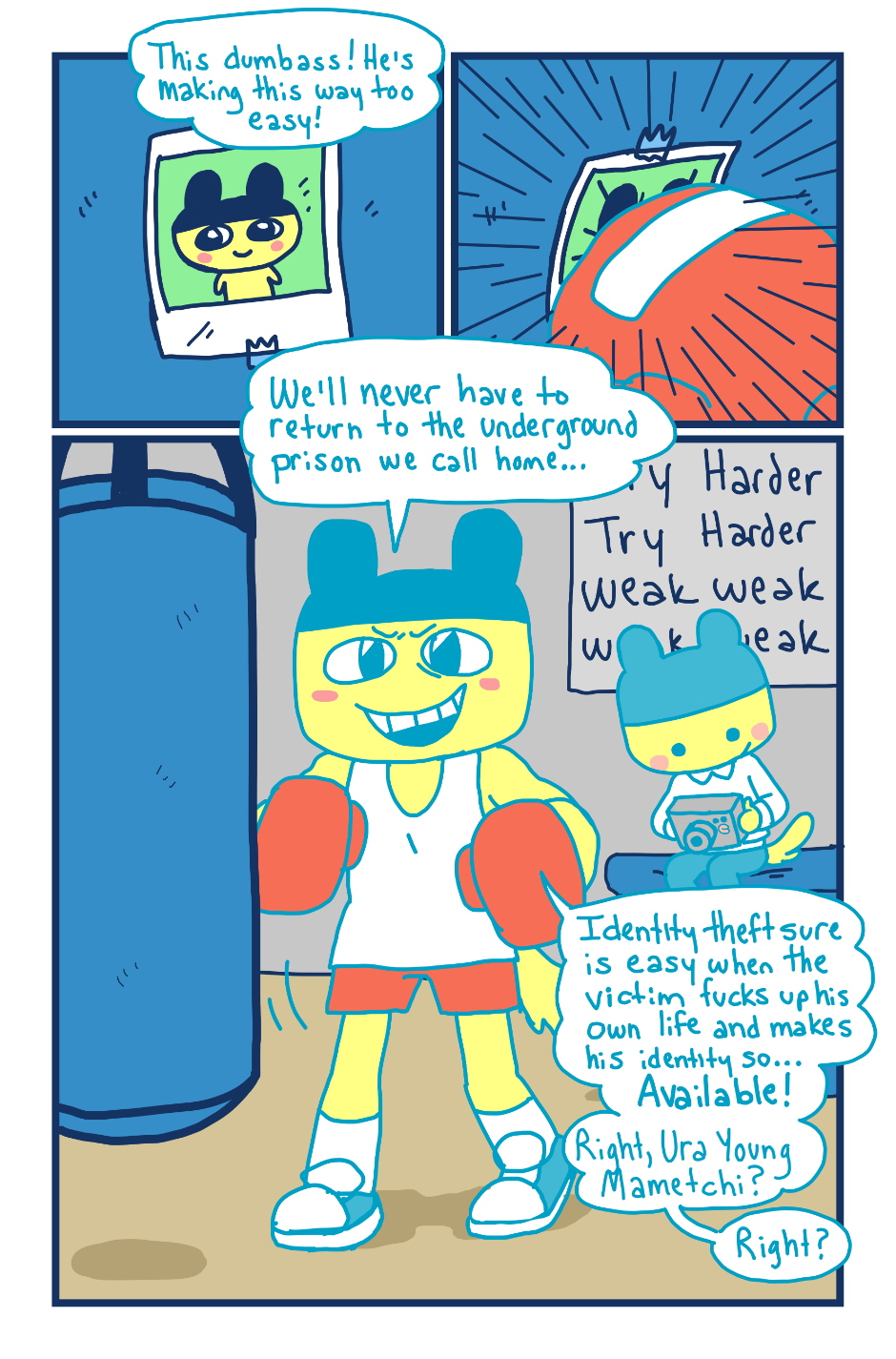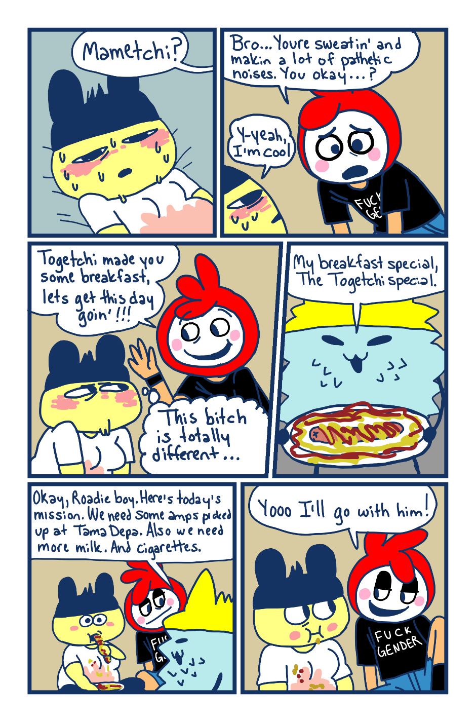 A fancomic/parody for the Tamagotchi series by Bandai. This story follows Mametchi and Kuromametchi 10 years after their prime time. Mametchi finds himself at a dead end in life. He sleeps on Kuromametchi's floor and has no job or money. Kuromametchi is tired of living with Mametchi, who is openly homophobic, but feels bad for his old friend. This story follows Mametchi as he tries to become a decent person and mend his broken relationships.