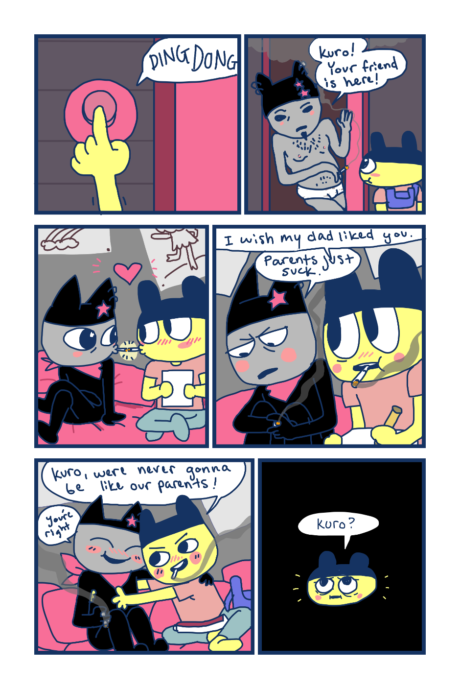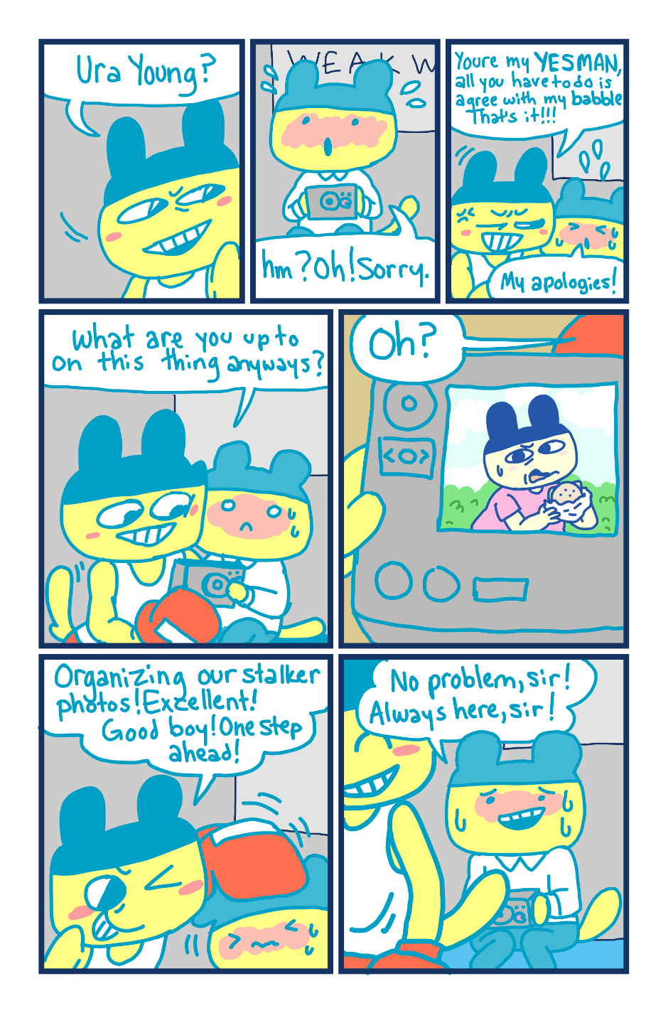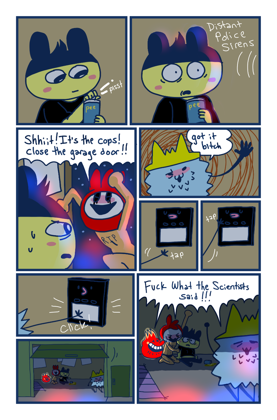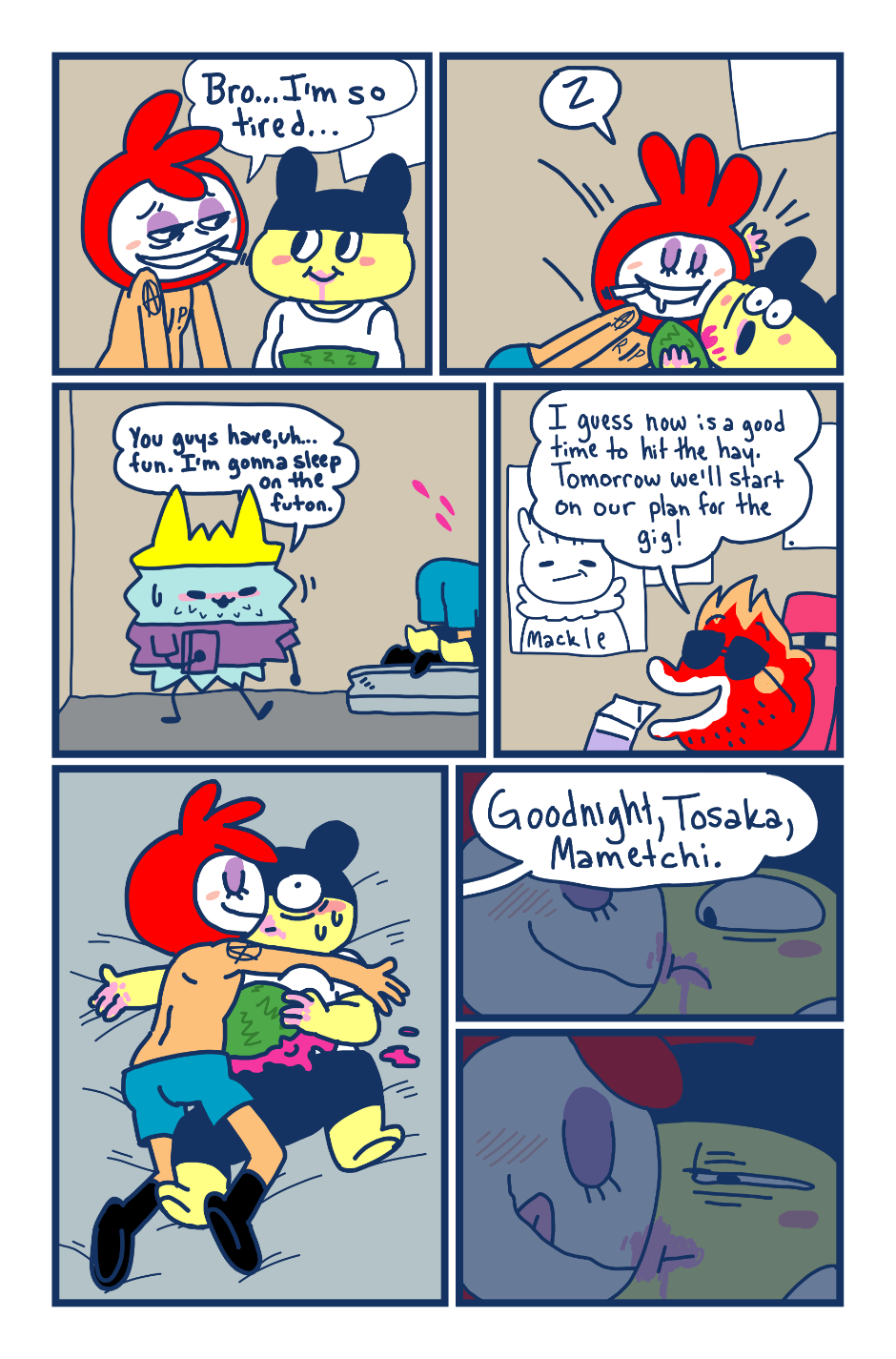 A fancomic/parody for the Tamagotchi series by Bandai. This story follows Mametchi and Kuromametchi 10 years after their prime time. Mametchi finds himself at a dead end in life. He sleeps on Kuromametchi's floor and has no job or money. Kuromametchi is tired of living with Mametchi, who is openly homophobic, but feels bad for his old friend. This story follows Mametchi as he tries to become a decent person and mend his broken relationships.