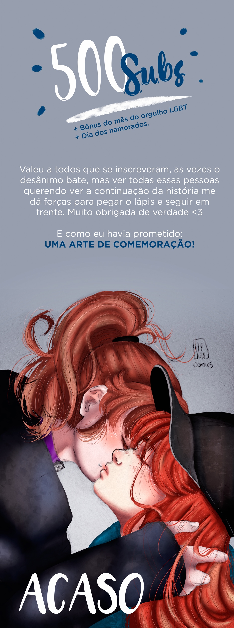 Estava bem pra baixo e não sabia quando conseguiria voltar a desenhar acaso, mas ver todos empolgados com a história e bater a meta de 500 inscritos, mesmo não postando, me fez ficar muito feliz <3 de verdade obrigada, vcs são incríveis.