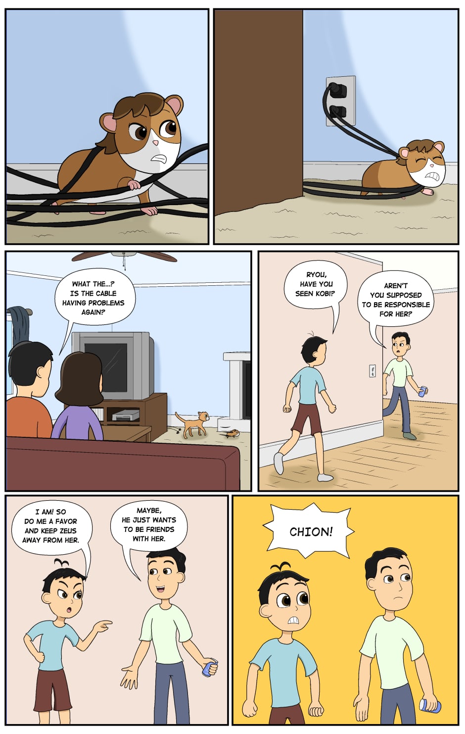 Chion and Kobi is a slice-of-life webcomic about a boy and his pet guinea pig. The story is set in Pinetown, a fictional Maine town close to the Canadian border. Chion Minami is a fun-loving and carefree 12-year old boy whose life takes a new direction when he adopts his new pet guinea pig, Kobi. With Kobi at his side, Chion broadens his scope during his transition to teenhood. Follow Chion and Kobi on their adventures as they bond with their friends, face life's challenges, and embark on journeys through the forests of Maine to the big cities of New England.