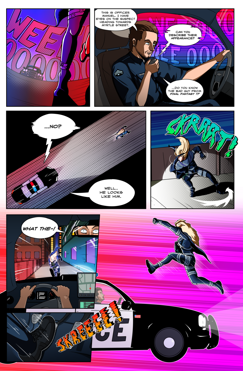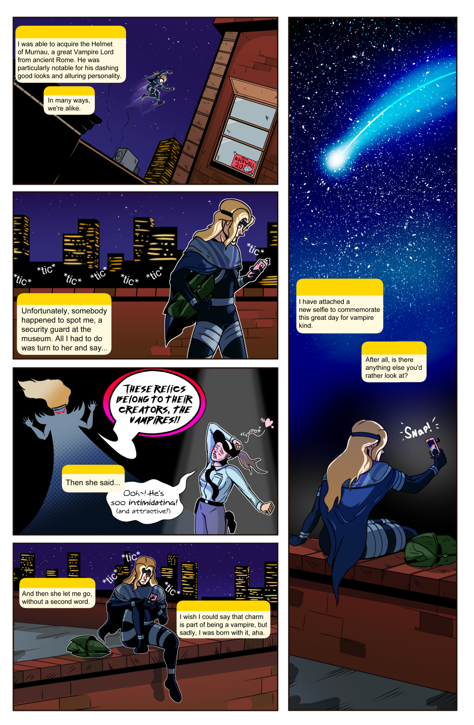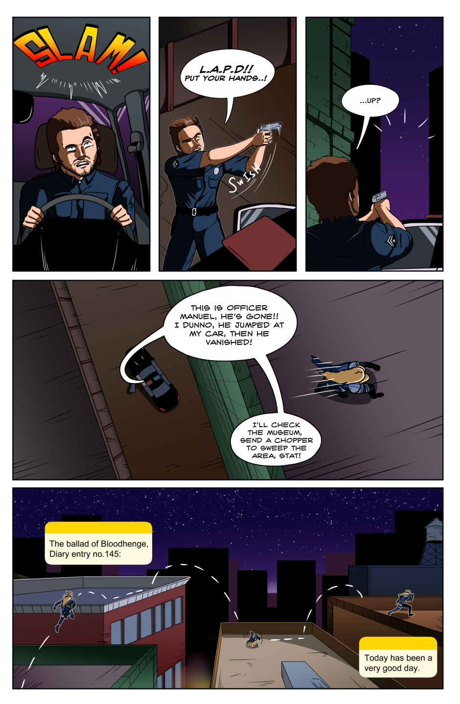 In a world in which superpowered individuals called "Star Children" are born once a year; we follow the journey of the lone Vampire thief Axel Bloodhenge (and his new "friend": Floyd), as they travel the U.S.A. in search of his stolen Vampire Artefacts. Who were the men that robbed Axel? What do they want with him? Why won't he eat a perfectly good Burrito!? The answers to these questions and MORE can be found in the pages of STRANGEWORLD!