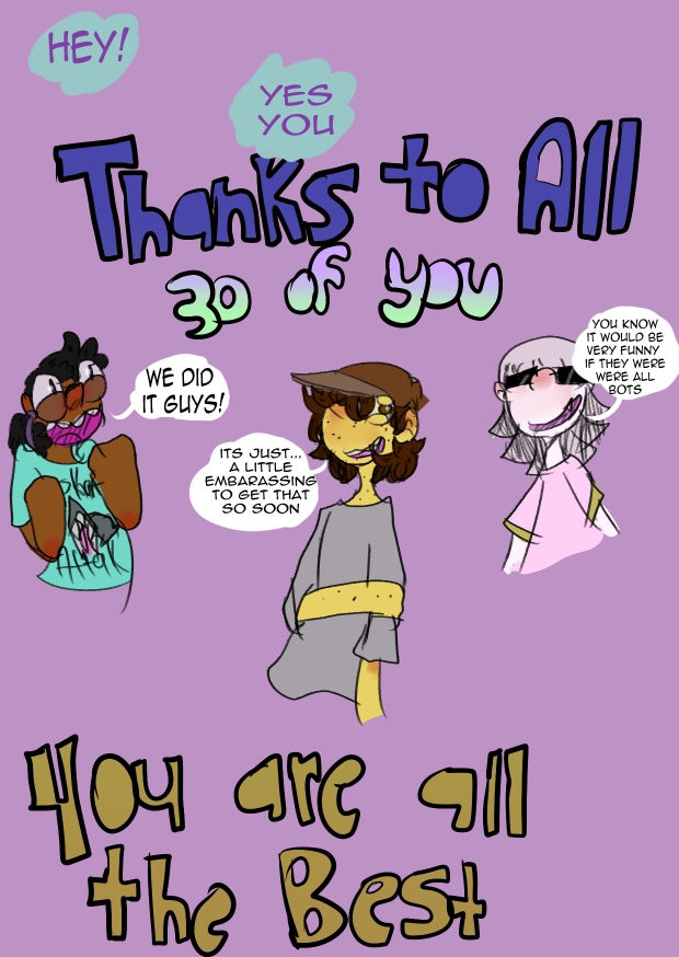 Thank you all. I was planning more 25 sub celebration, but 30 subs is a nice round number. I really appreciate all of you. And I hope to grow as both an artist and a story teller throughout this comic's journey. Thank you