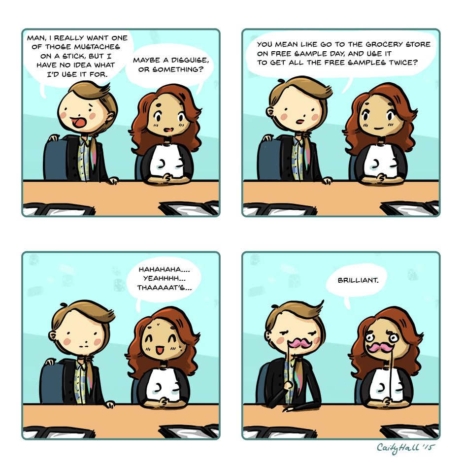 once i went to the grocery store and the ladies there we wearing fake mustaches, so I complimented them and they said, "thanks! Do you want one?" and I had great facial hair for the rest of that day.