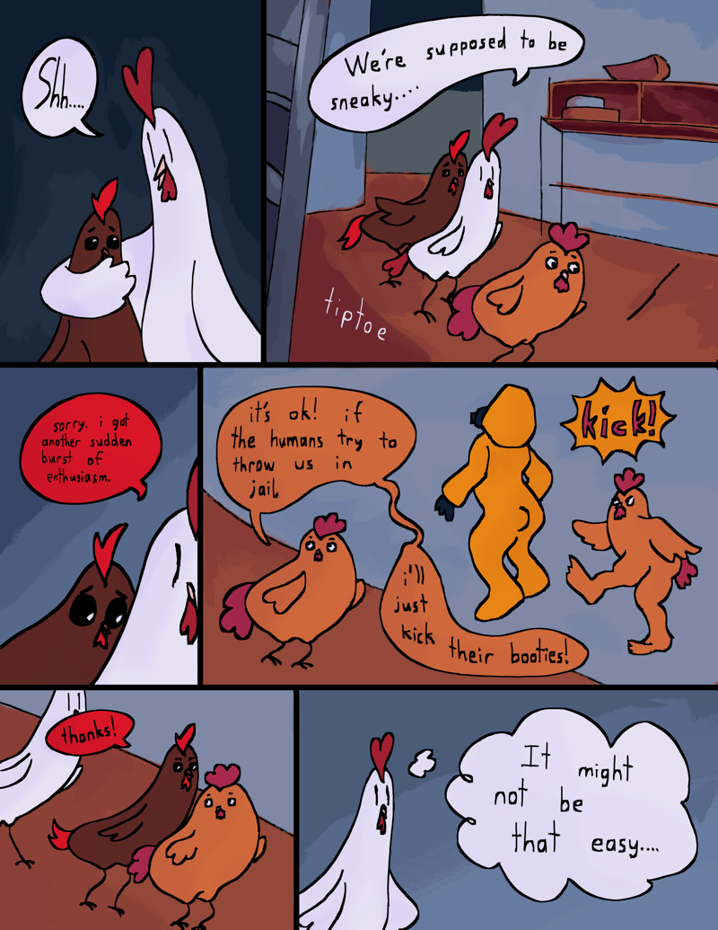 A silly comic about 3 magical chickens who do crime! Their names are Choik, Chuck, and Chipper, and they will not let anyone stop them from engaging in criminal shenanigans. The threat of being caught by the humans is constantly looming over their heads, but they don't care about that! Choik can outwit them with his super-smart chicken brain, Chuck can kick their butts with his muscular legs, and Chipper can scream at them really loudly!
