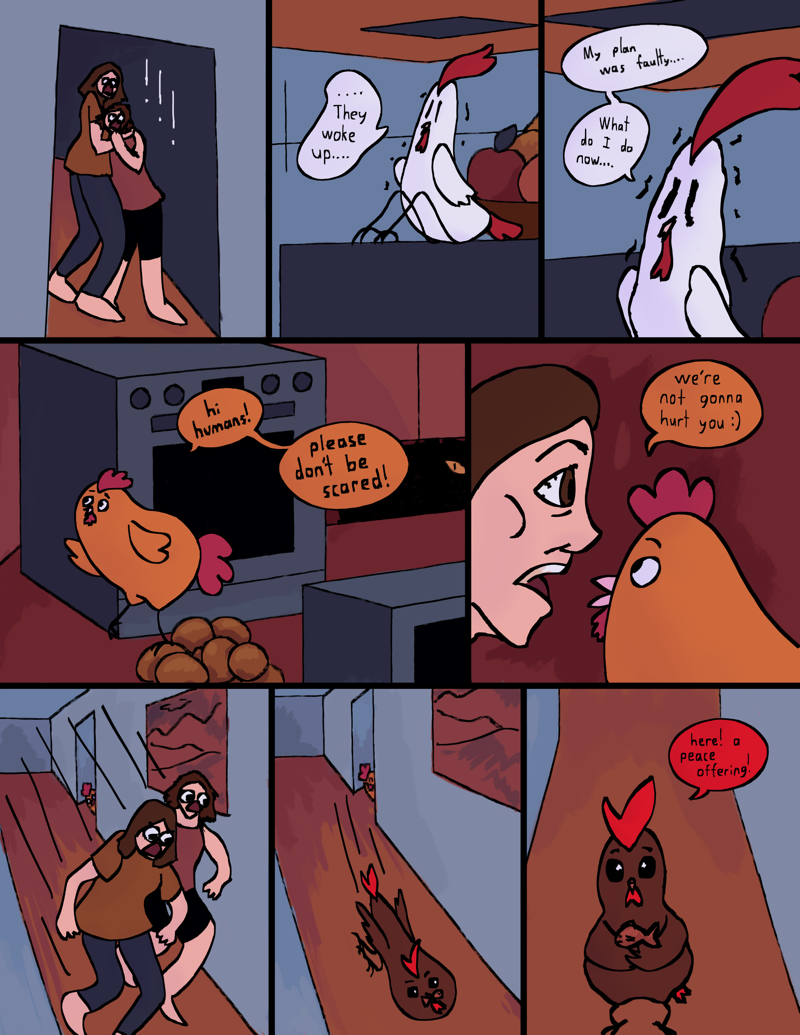 A silly comic about 3 magical chickens who do crime! Their names are Choik, Chuck, and Chipper, and they will not let anyone stop them from engaging in criminal shenanigans. The threat of being caught by the humans is constantly looming over their heads, but they don't care about that! Choik can outwit them with his super-smart chicken brain, Chuck can kick their butts with his muscular legs, and Chipper can scream at them really loudly!