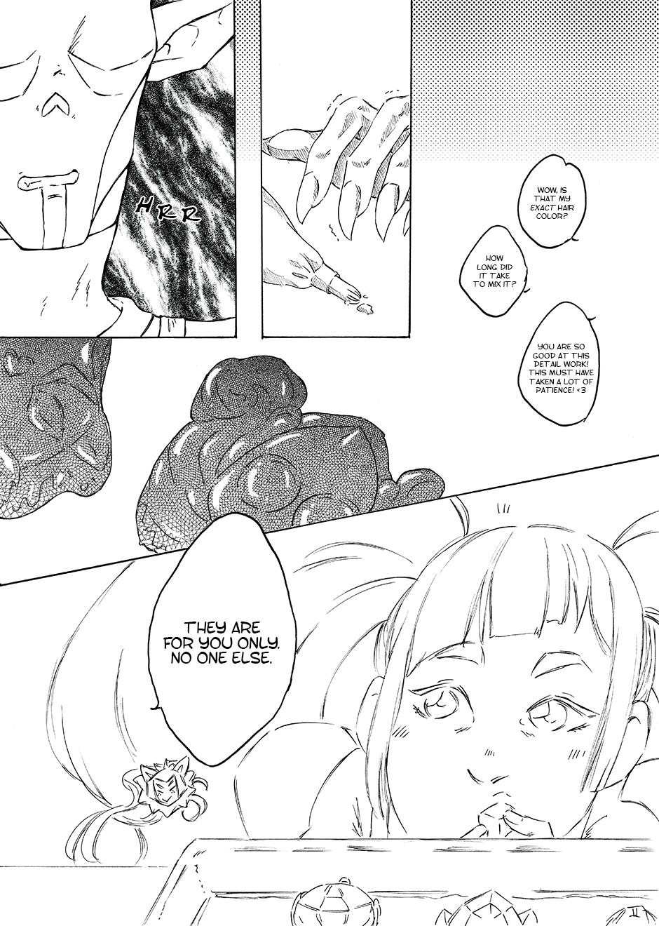 "Anger crept through his body and Hordak put the icing bag aside to avoid accidentally spreading lavender coloured chocolate all over the room. He had just used it to imitate Entrapta's hair, as she now realized, very excitedly. This time he couldn't even be ashamed of the warmth in his head, maybe it was just the rage rising inside him." (I mayyy have written a fic before turning this into a comic and this is a really nice part, if I dare say so myself.)