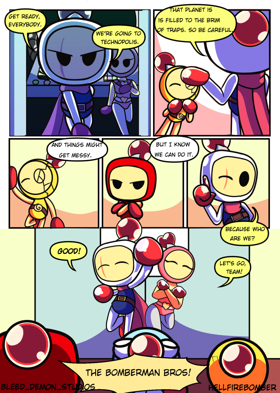 Bomberman Galaxy is a story that follows Pink and White Bomber (aka Bomberman himself). Part of a rebel group called the Bomberman Bros, they travel around the star system to spread the idea of free will and stop the Five (now Four) Dastardly Authority. But as time goes on, Pink slowly learns about the truth of one of their members, Pretty Bomber. Will Pink face the music, or shatter and explode when everything falls into place?
