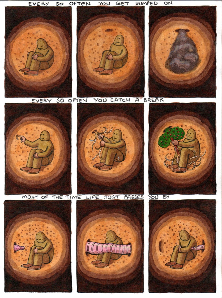 Godzilla’s Lockdown Diary, published here for the very first time by the Lakes International Comic Art Festival, emerged from a long series of drawings that Edward Taylor did in 2017, which looked at what Godzilla did underground when he wasn’t above ground fighting ludicrous monsters.