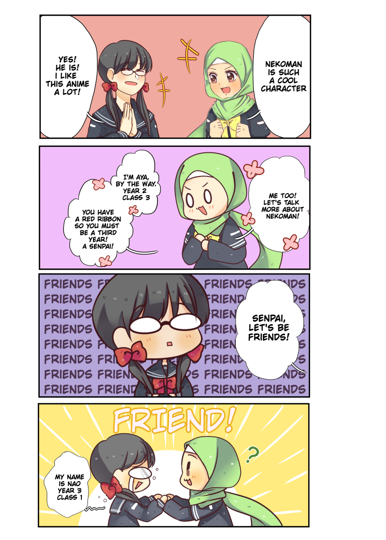 Follow the adventures of Aya and her friends as she establishes the Muslim Manga club in her high-school. "Aya is a little.. how do I say it nicely? so... very energetic. " - Sura