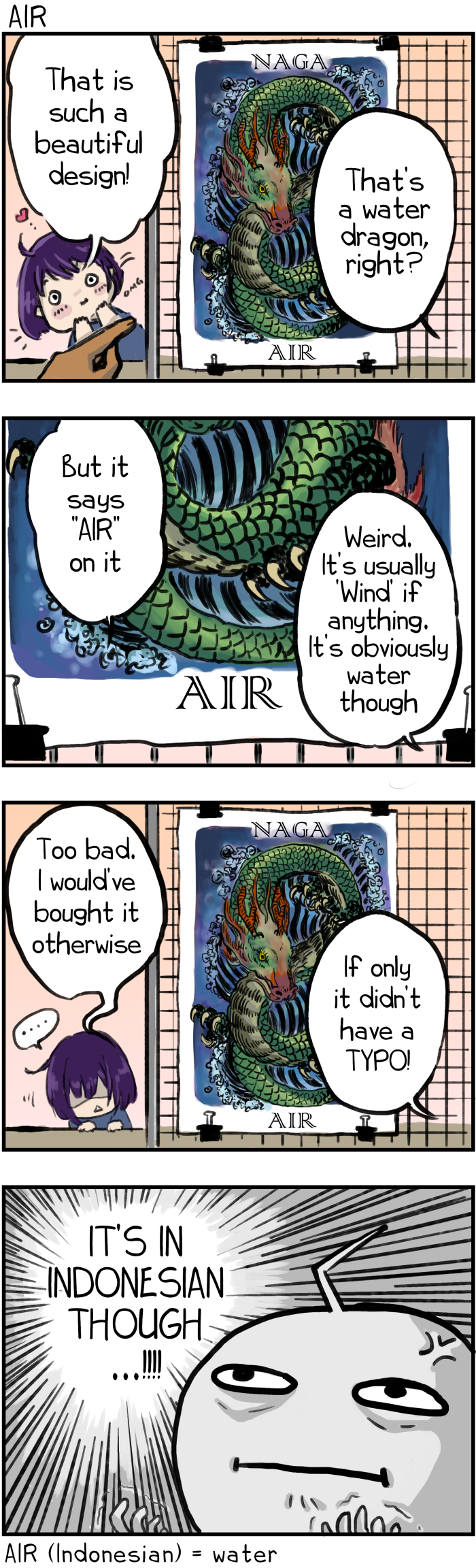 A short 4-panels strip comic visualizing linguistic differences and/or similarities commonly encountered in various situations in which two or more international individuals get involved...
