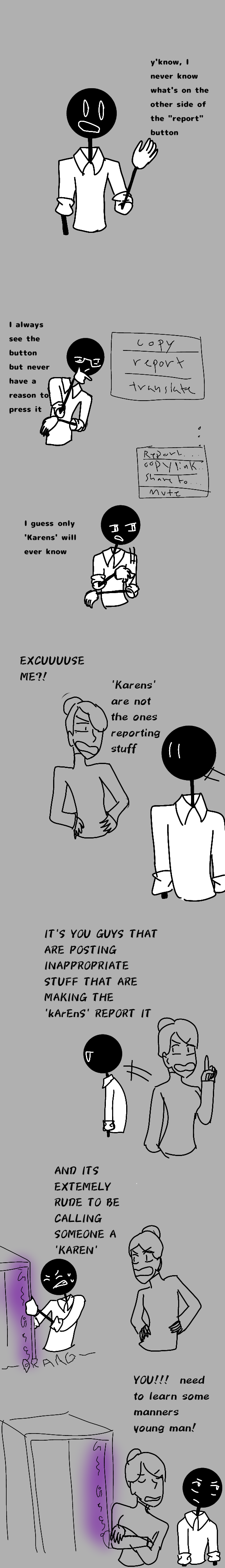 people exist . Karen's I'm reporting you! how dare you breathe the same air as me