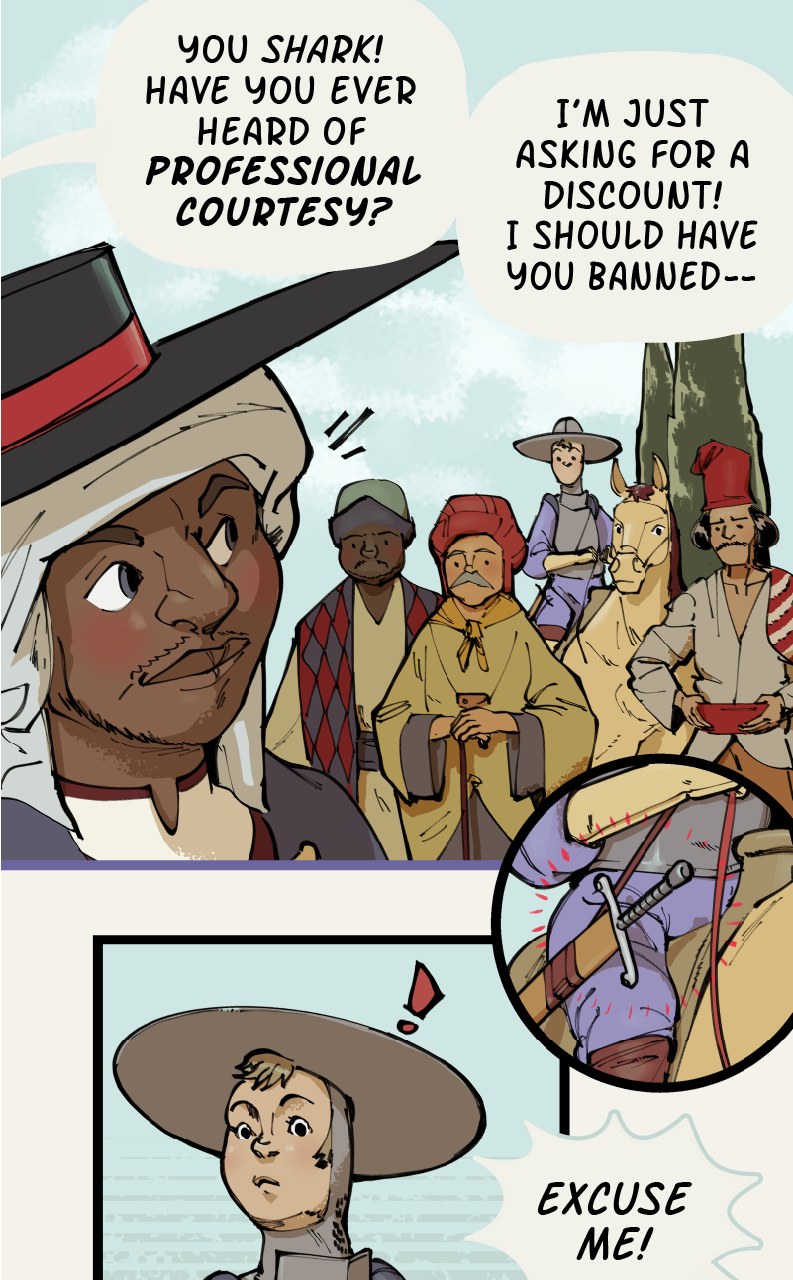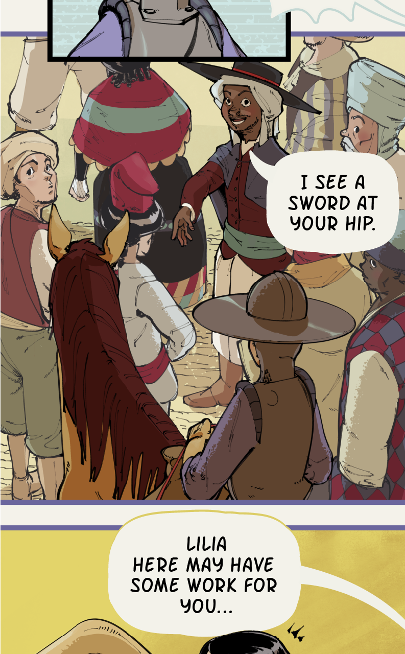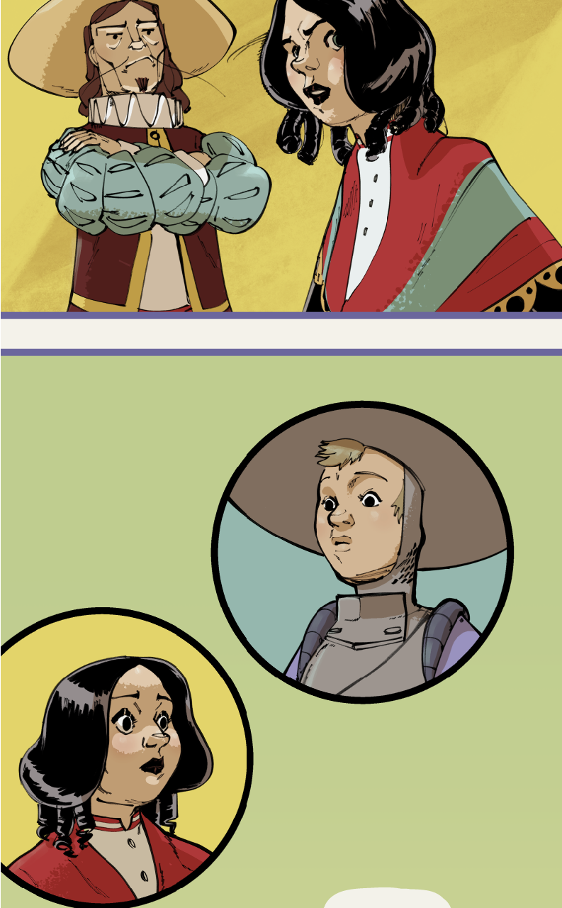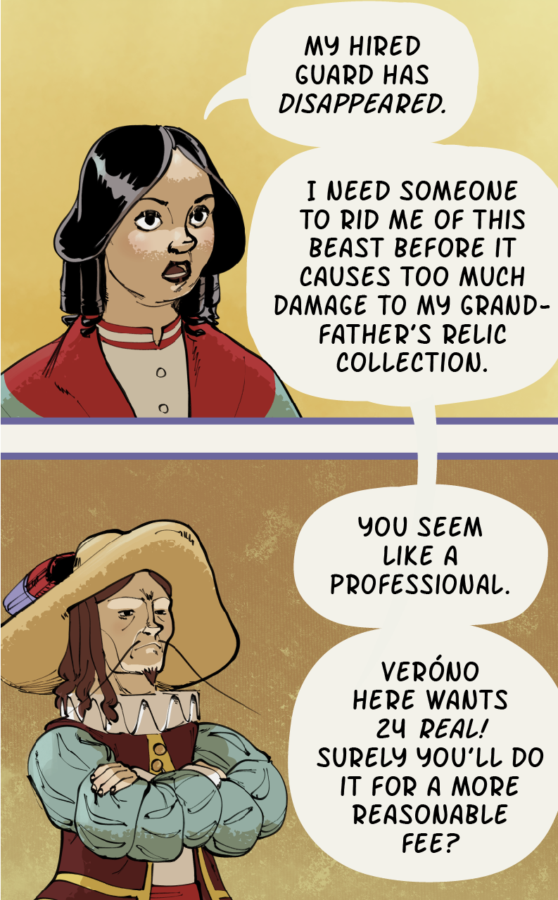 Set in a fantasy world loosely based on medieval Spain, Caballeras is a story about Lilia Vallejo, the last in a family line of adventurers turned magical relic dealers, and Ñona, an idealistic knight who (alongside her trusty steed Ocaño) chivalrously offers to help Lilia respond to a strange burglary at her family estate on the day of an important relic fair.