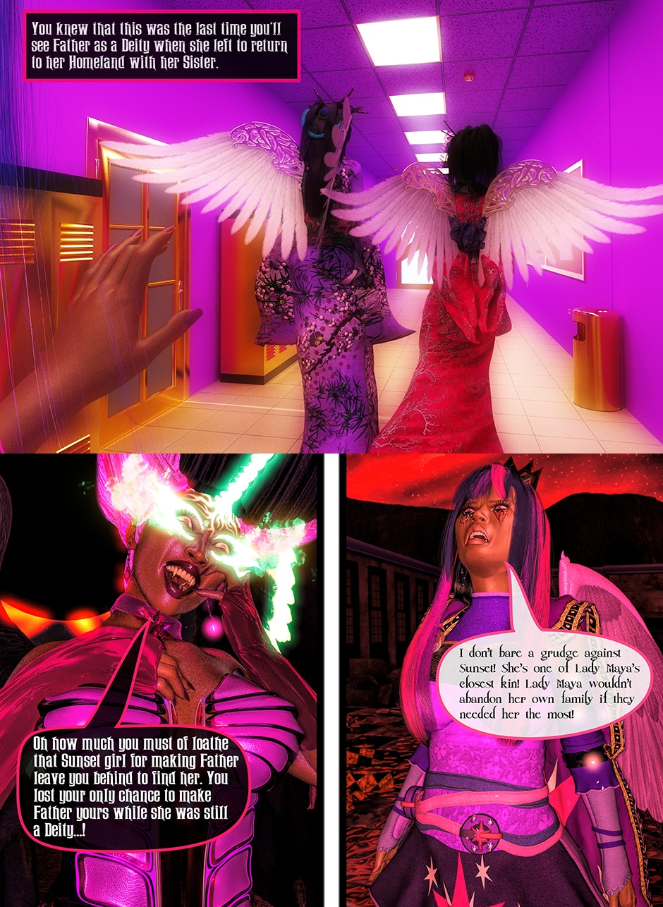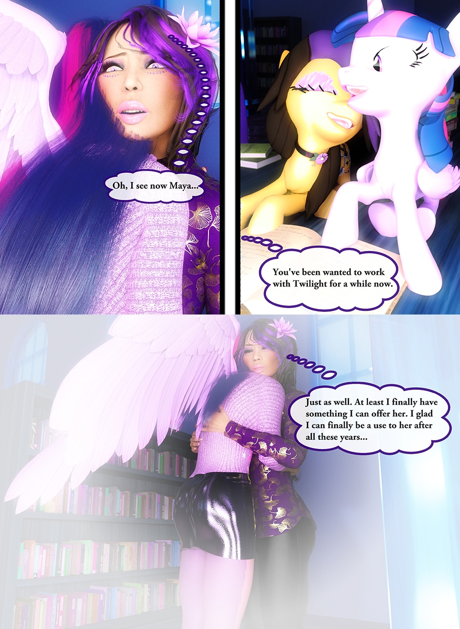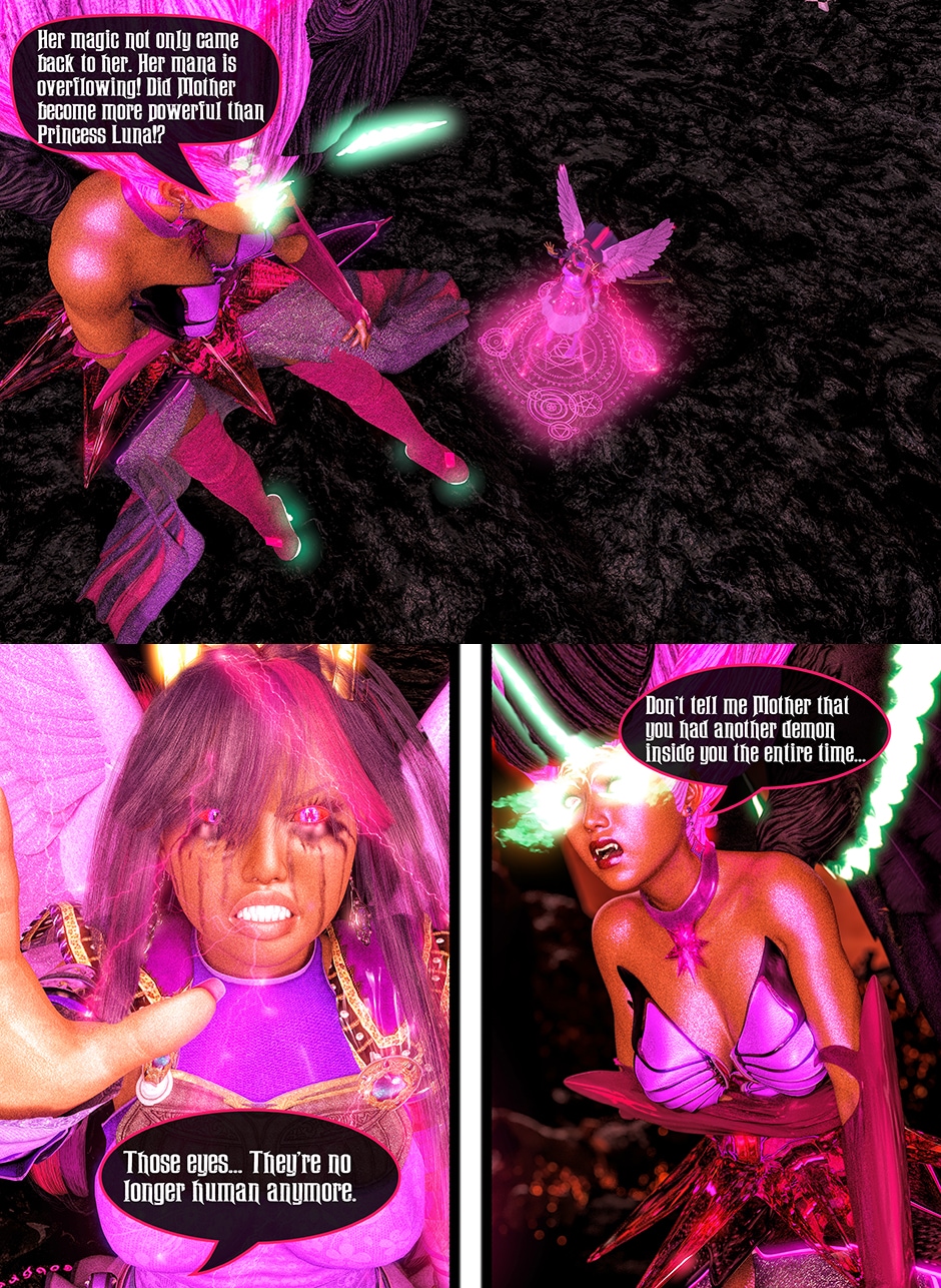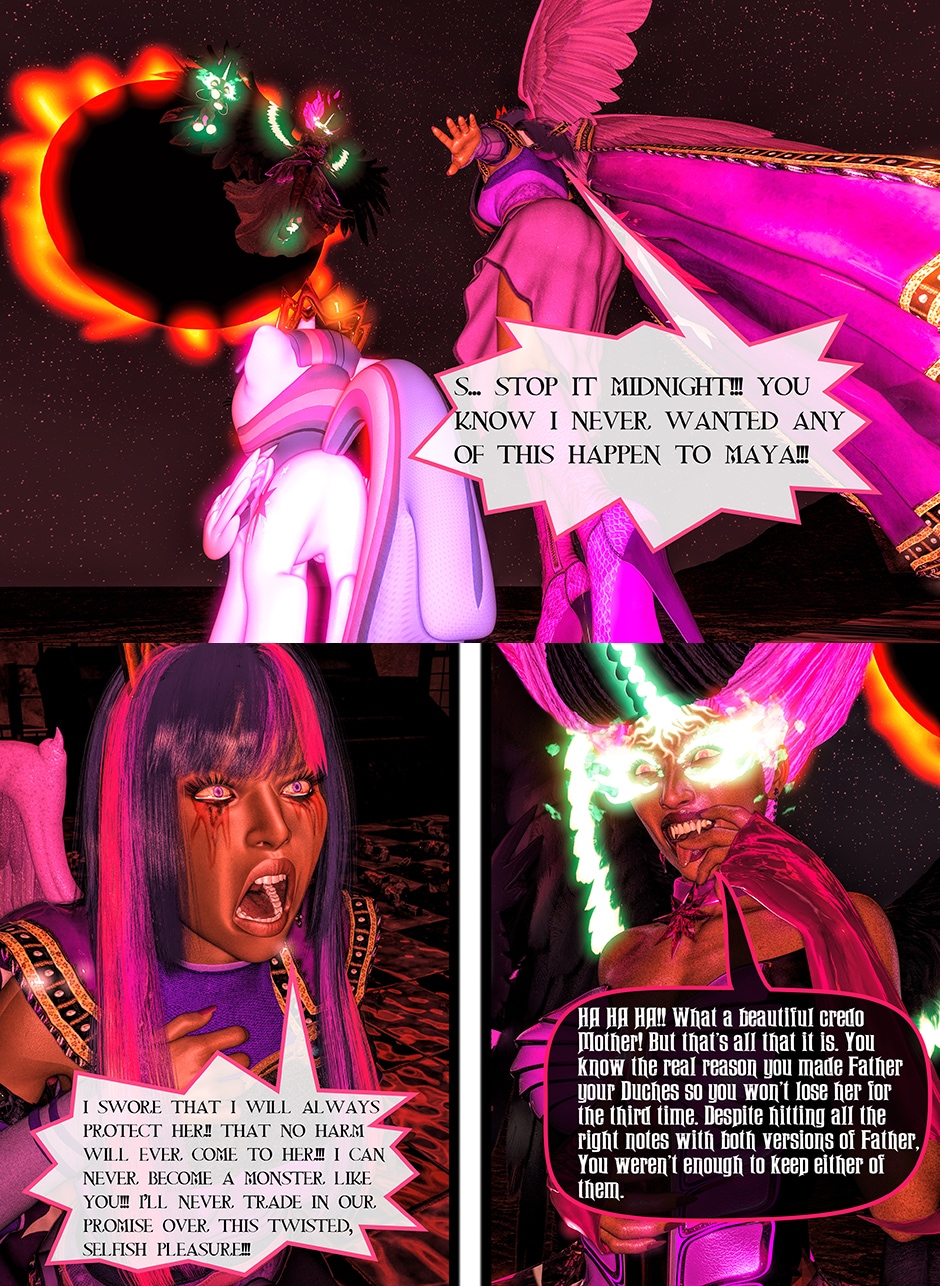 After seeing Lady Maya's body being mutilated by Midnight, Princess Twilight confronted her Succubus Doppelganger asking her why she did what she done to Maya. Midnight told Twilight that she reacted in her nature as a Succubus which is based on Twilight's deepest desires for Maya that she held for her entire life. Midnight plan to take over Twilight's body and take over Equestrian with Nightmare Moon and her fellow Succubi Sisters, and to torment Maya for all eternity. Twilight realized that she can't use her magic and fell into deep despair, but something else inside of her begin to awaken. This entity maybe even more dangerous than the Succubus That was created from Twilight's desires.