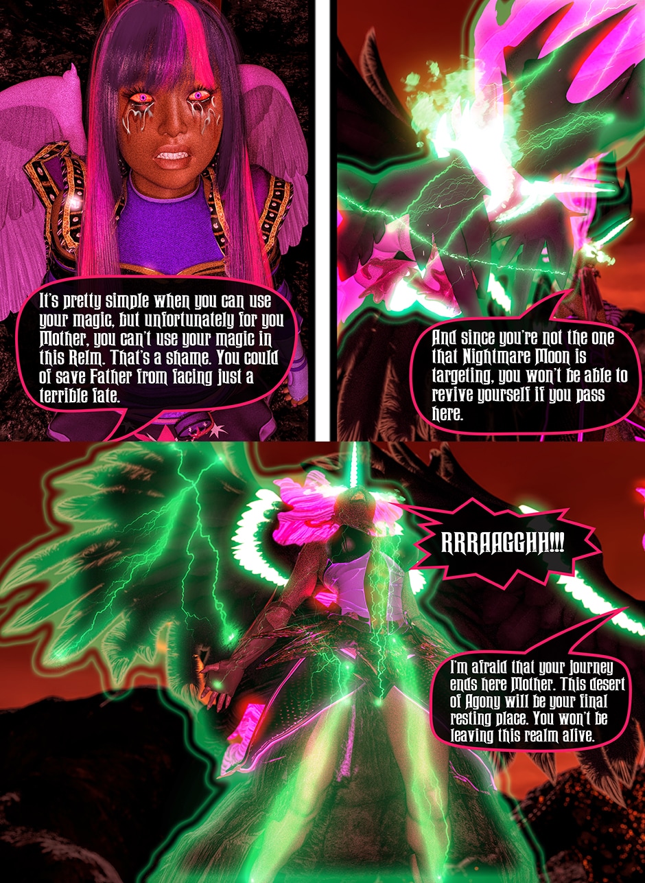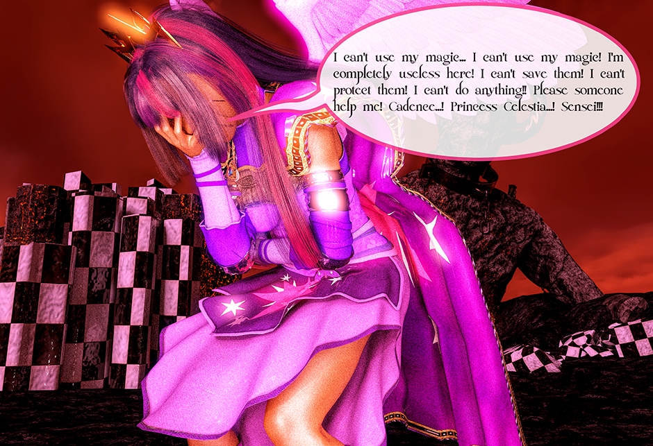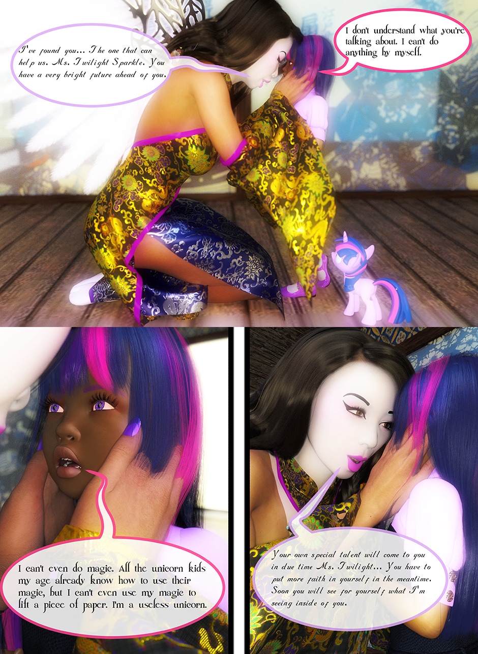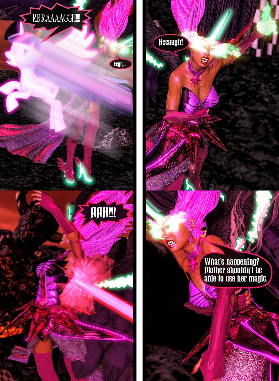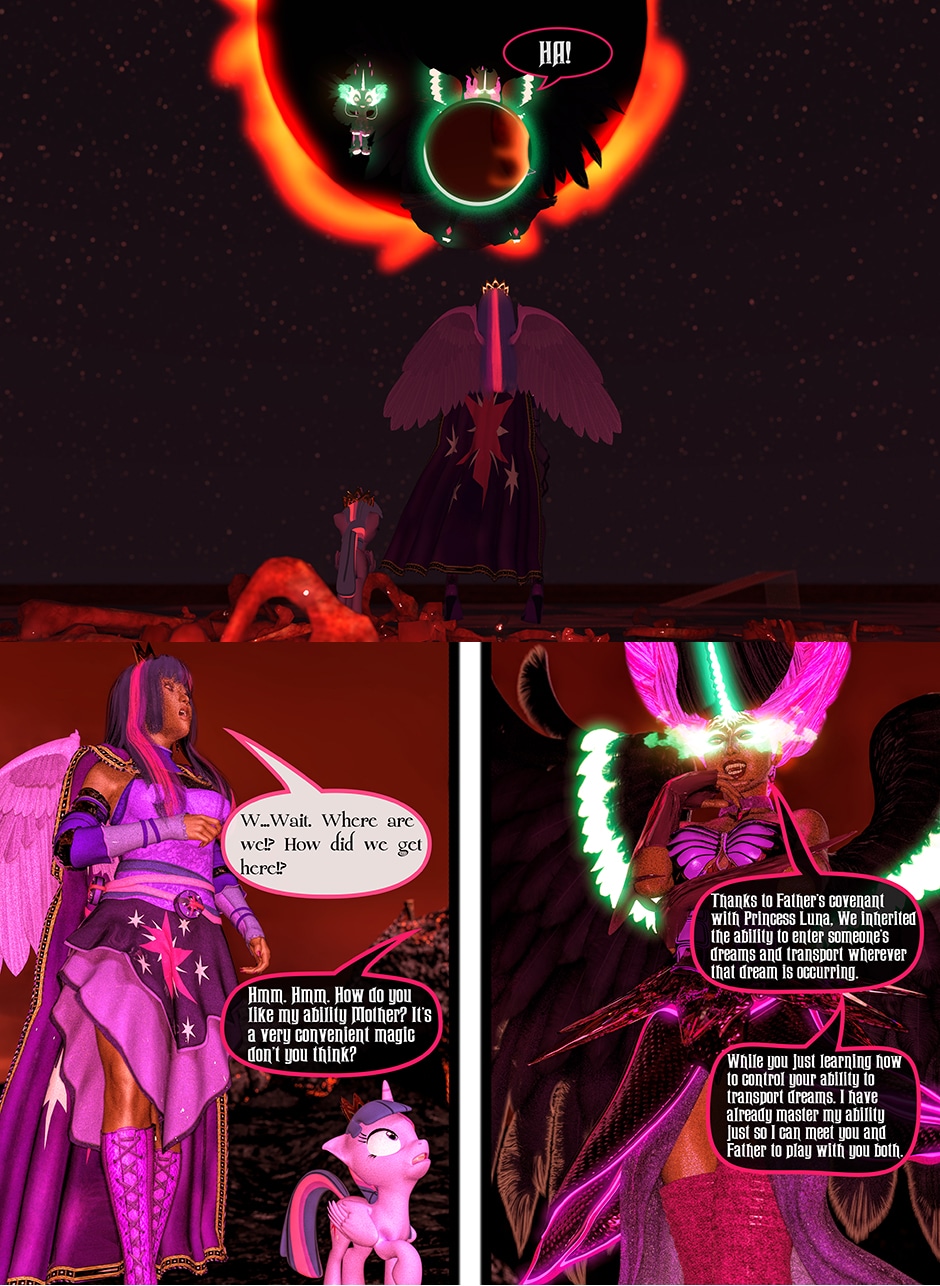 After seeing Lady Maya's body being mutilated by Midnight, Princess Twilight confronted her Succubus Doppelganger asking her why she did what she done to Maya. Midnight told Twilight that she reacted in her nature as a Succubus which is based on Twilight's deepest desires for Maya that she held for her entire life. Midnight plan to take over Twilight's body and take over Equestrian with Nightmare Moon and her fellow Succubi Sisters, and to torment Maya for all eternity. Twilight realized that she can't use her magic and fell into deep despair, but something else inside of her begin to awaken. This entity maybe even more dangerous than the Succubus That was created from Twilight's desires.
