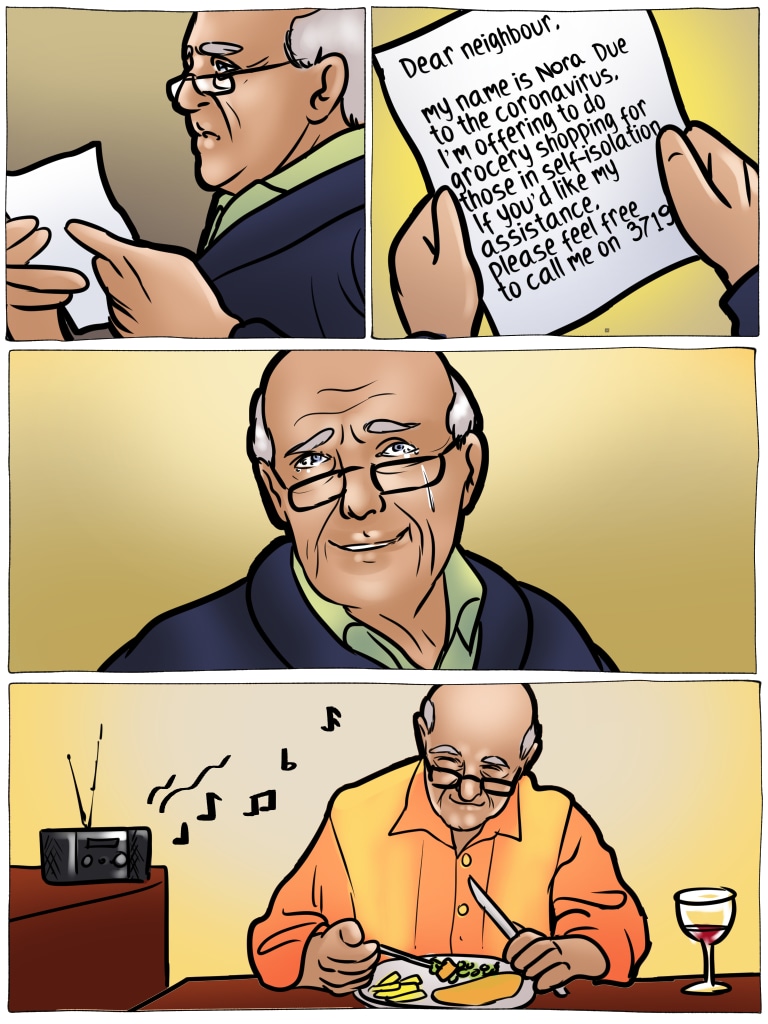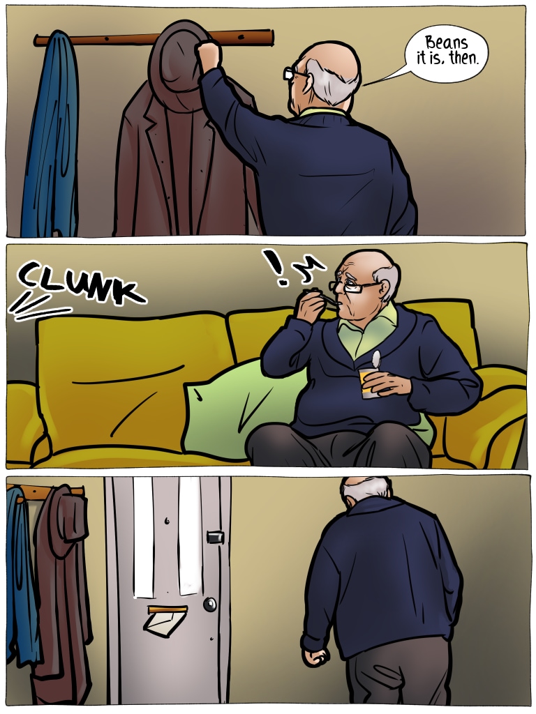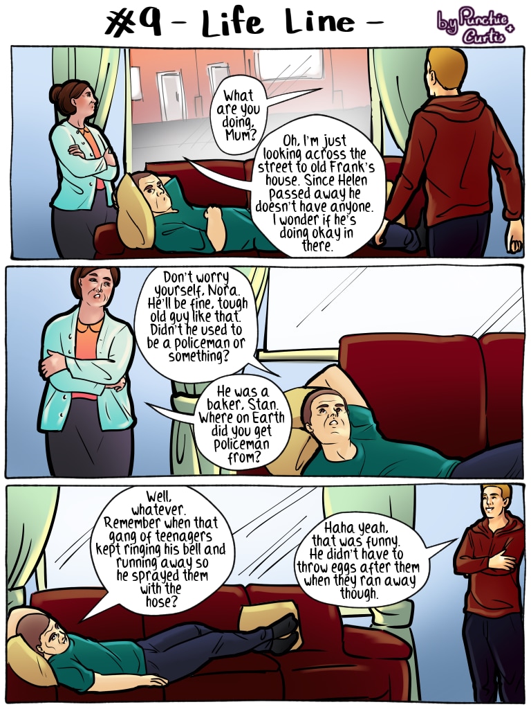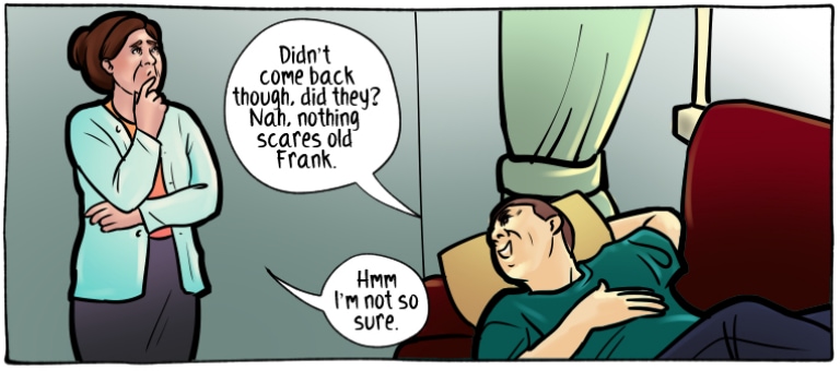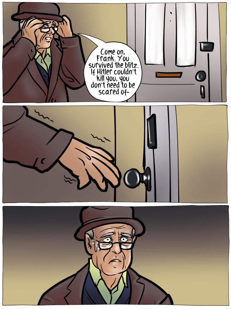 I actually started crying when he was shaking in fear. I didn’t get the chance to visit my grandma one last time when she was dying of cancer because she was terrified of catching Covid. She canceled my visit despite my quarantine and passed away less than a week later. I appreciate Frank’s fear more than anything in this comic