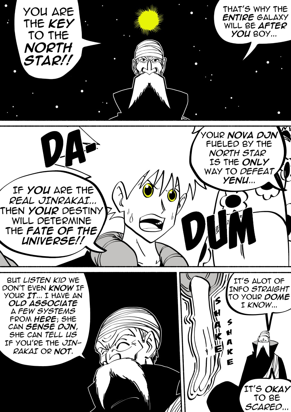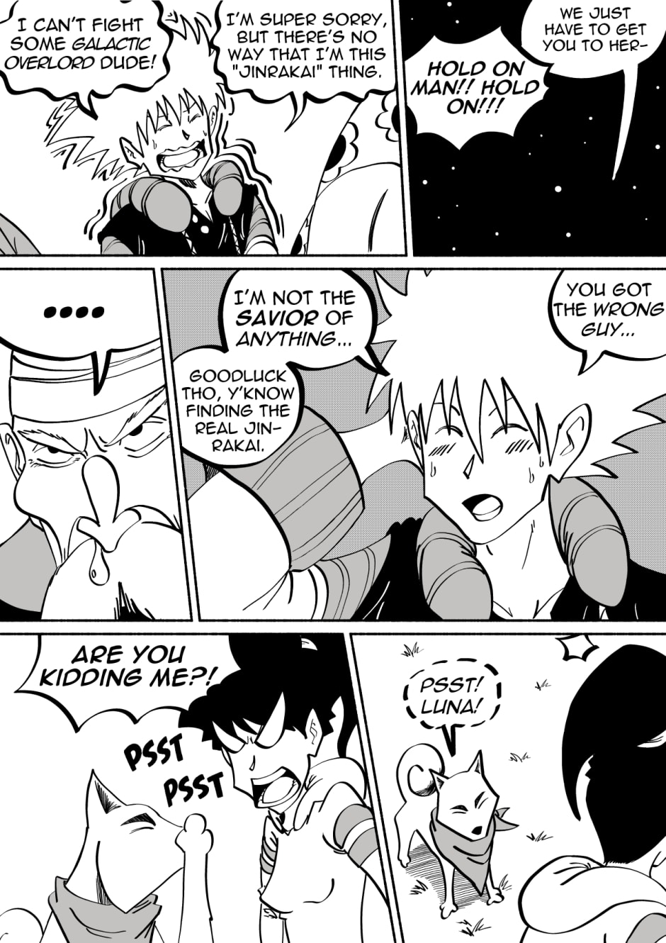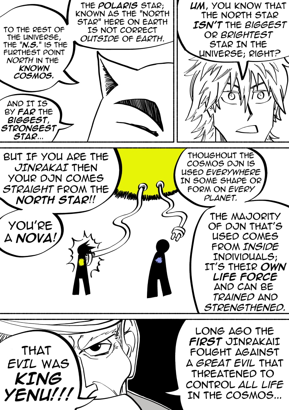 Welcome to the new space opera that is JinRakai: Savior of the Universe! Read along as Bit's peaceful life on Earth must come to an end because unbeknownst to him, Bit is actually the Legendary JinRakai!! Born with the powers of the Northstar, Bit must race across the Cosmos to the Northstar, and defeat King Yenu, the evil ruler of the Celestial Kingdom! Can Bit live up to the title of Savior of the Universe?