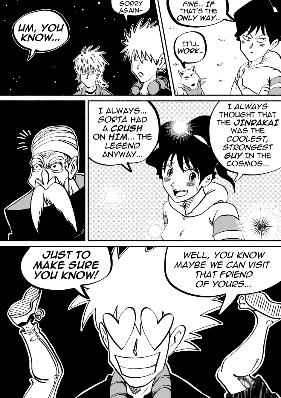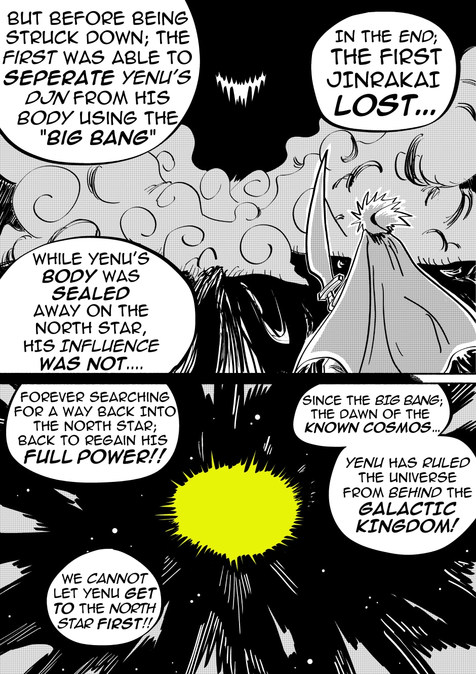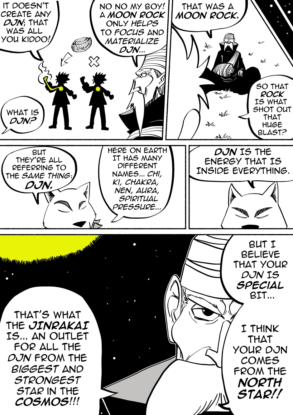 Welcome to the new space opera that is JinRakai: Savior of the Universe! Read along as Bit's peaceful life on Earth must come to an end because unbeknownst to him, Bit is actually the Legendary JinRakai!! Born with the powers of the Northstar, Bit must race across the Cosmos to the Northstar, and defeat King Yenu, the evil ruler of the Celestial Kingdom! Can Bit live up to the title of Savior of the Universe?