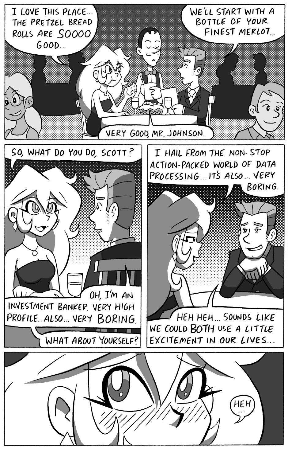 This page and the next were originally just one single page, but I felt it didn't really give enough time to show these two were making a connection, so I added a bit of flirting between the two here. It also caused me to expand the whole story from a 16 page comic to a 20 page, but I think that was for the best, since I had more room to establish personalities more.