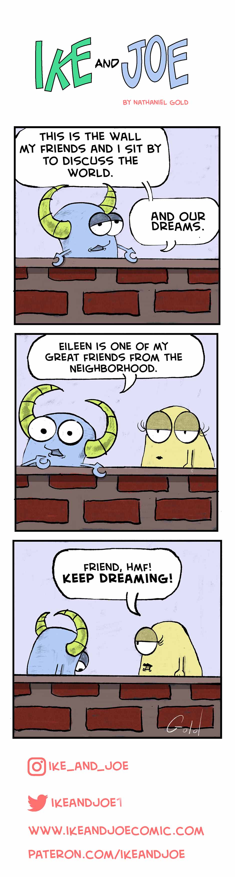 Ike and Joe is a comic strip about two young monsters and their friends dealing with everyday life in the 21st century. Inspired by the great comic strips of my youth such as Peanuts, Calvin and Hobbes and The Far Side as well as classic comedic duos such as Laurel and Hardy or Abbott and Costello all cooked together with a sprinkle of Bert and Ernie.