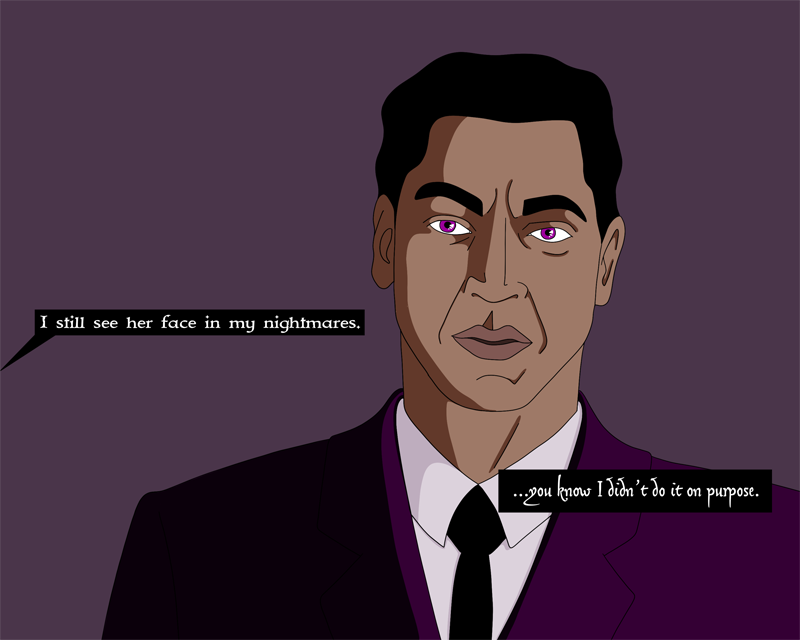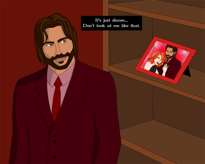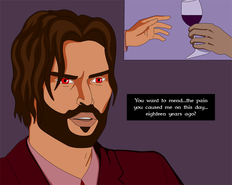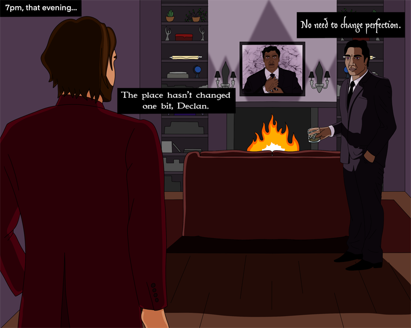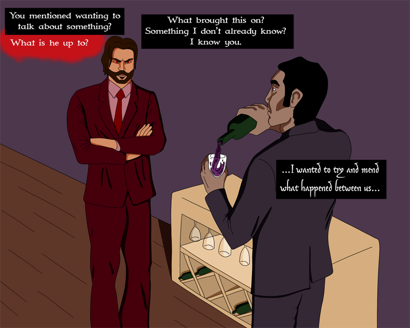 Asmodeus and Declan have a chat over drinks.