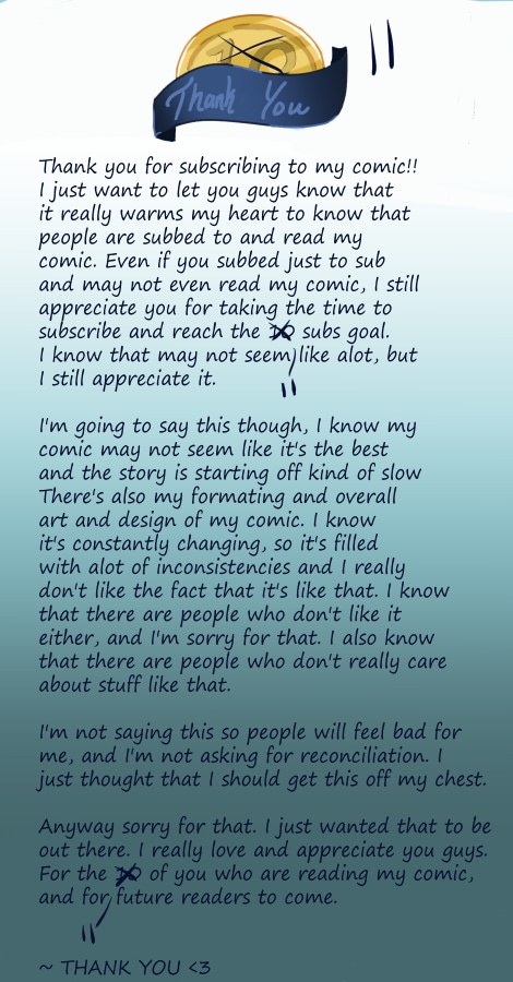 Congrats on reaching 10 subs! Making a comic takes a lot of work, and I'm so glad you're putting in the time and effort to share a story you care about with the world :D You might not be the happiest with your work, but it says a LOT that you're sticking with it and continuing to make something. Given time, we all improve, and I can't wait to see where you end up, and where this story is heading. Good luck, take care, and I'm happy to be along for the ride.
