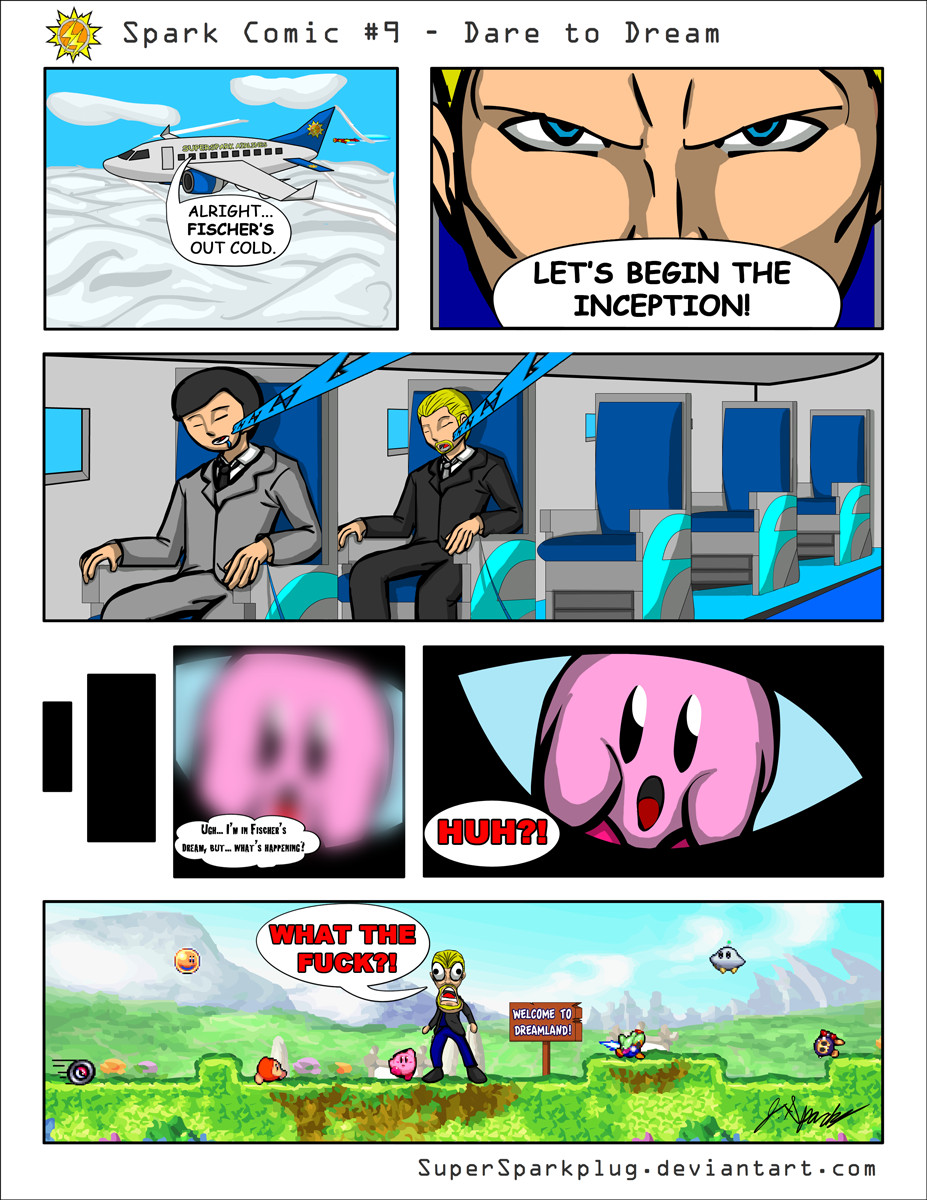 Inception was a fantastic movie and easily among my top 10 films of last year. However, I always wondered if they kept going into dreams, who knows what messed up fantasies they'll find. Then I thought something else: What if the Inception crew tried to get into a dream and ended up in Kirby's Dreamland?
