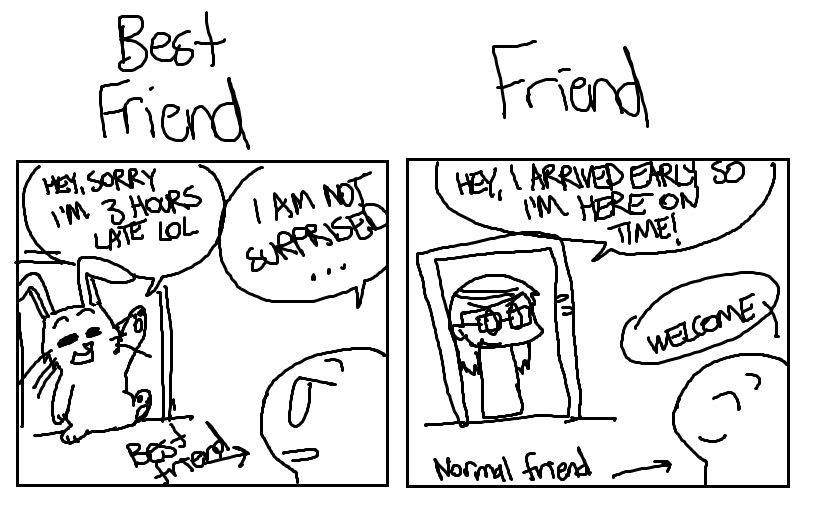 I take my time with my best friend and am more relaxed, but with friends, I try to get there on time-- always.