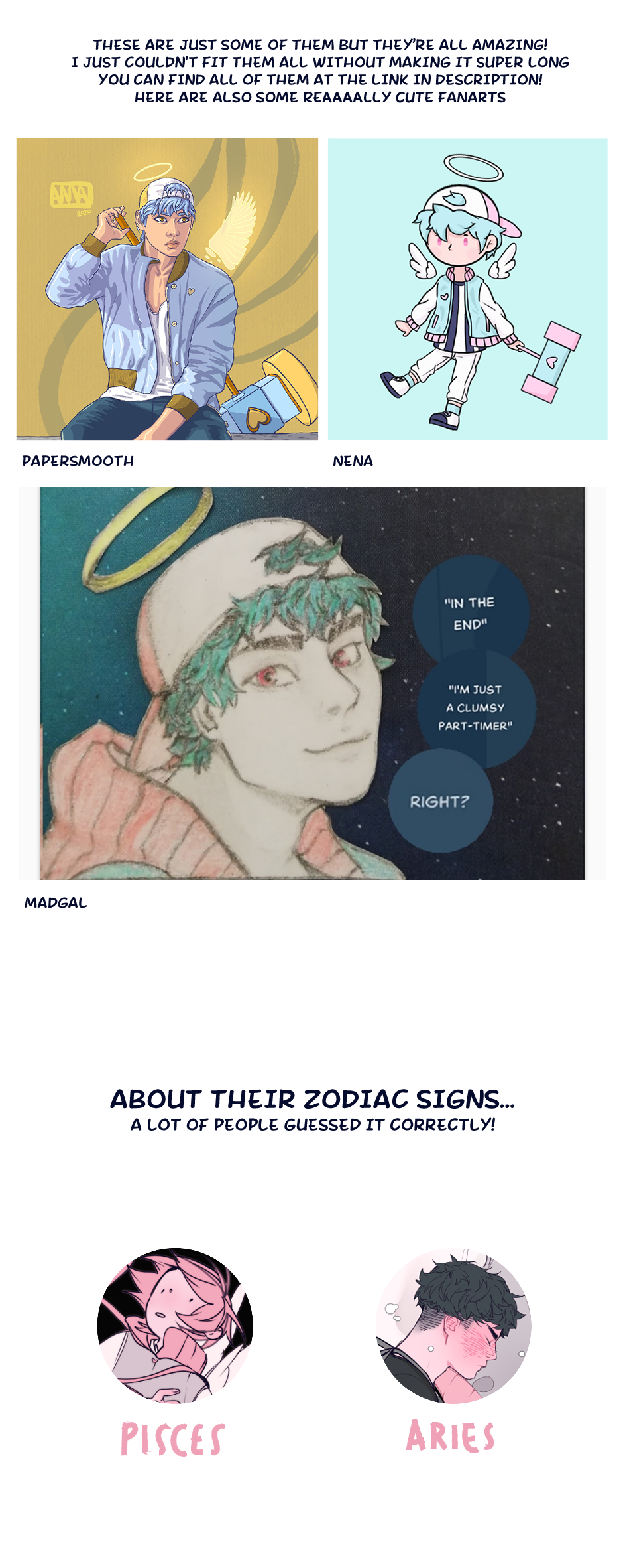 "Not seen anyone say this yet but I think Fran is an Aries. Aries can be tough and can come across as unapproachable. But when you get to know them, they are not as fierce as they seem. They also tend to trust their intuition and aren't afraid to voice their opinion or speak up when someone/something is wrong. Though sometimes they say things a little too bluntly haha. Fran just makes me think of all these things. (Btw this is based off my limited knowledge of zodiac and mainly based off the Aries I know, including myself) I think Racha is maybe a Pisces. First off, the symbol of the Pisces sign is two fish swimming opposite each other, which represents the constant division of their attention between fantasy and reality, which I feel just sort of suits how he acts. Pisces also tend to be quite emotional and can sometimes become swallowed by emotion, but most of the time they can regain their footing (I hope that makes sense). They are often told they are fun people and try to make the best of the time they have. They are a very passionate sign, which would contribute to Racha's constant cycle of falling in love at first sight. I just thought this description fits Racha quite well but again, I'm not the most knowledgeable when it comes to signs and a lot of my knowledge is from people I know. Aries and Pisces are also great relationship partners together hehe. These two in a relationship is pretty much hit or miss. Because they are very contrasting signs, they can find it hard to keep a relationship going. However, because they make up for what each other lacks, they can also make a great and powerful couple and their teamwork is on point!"