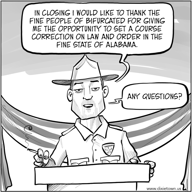 Hi my name is Deedee and I’m the undersecretary to the undersheriff of Random County Alabama. This story that is about to unfold in front of you is the unvarnished horrifying truth of the goings on in one our small towns from the viewpoint of the local Sheriff’s office. Please don’t ask me how I know – I just do. Enjoy the ride. I’ll explain more about who these characters are as the whole mess unfolds. Welcome to Bifurcated, Alabama aka “Dixietown”.