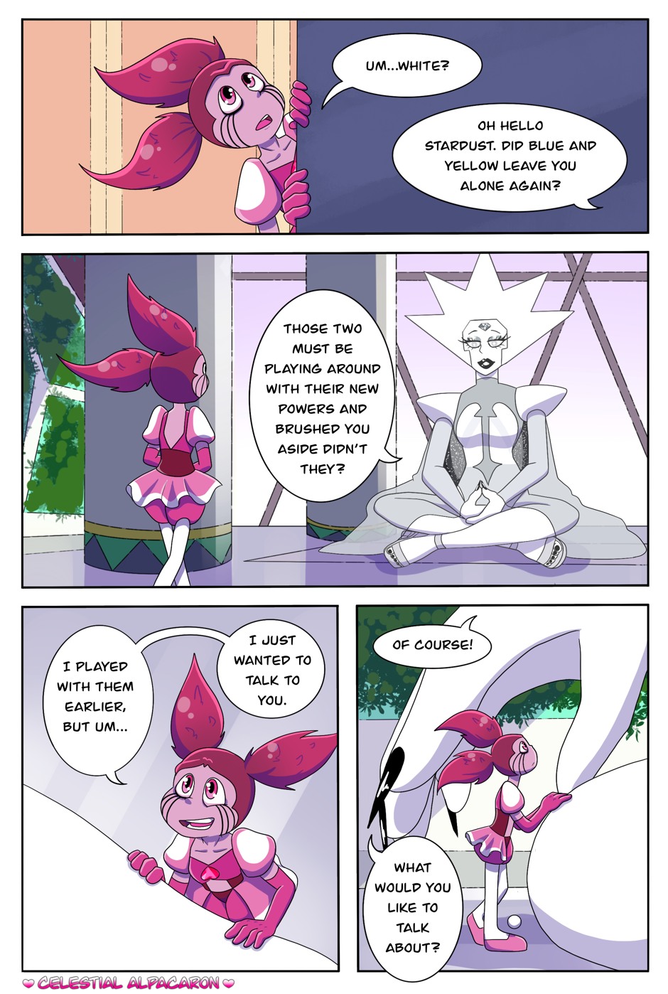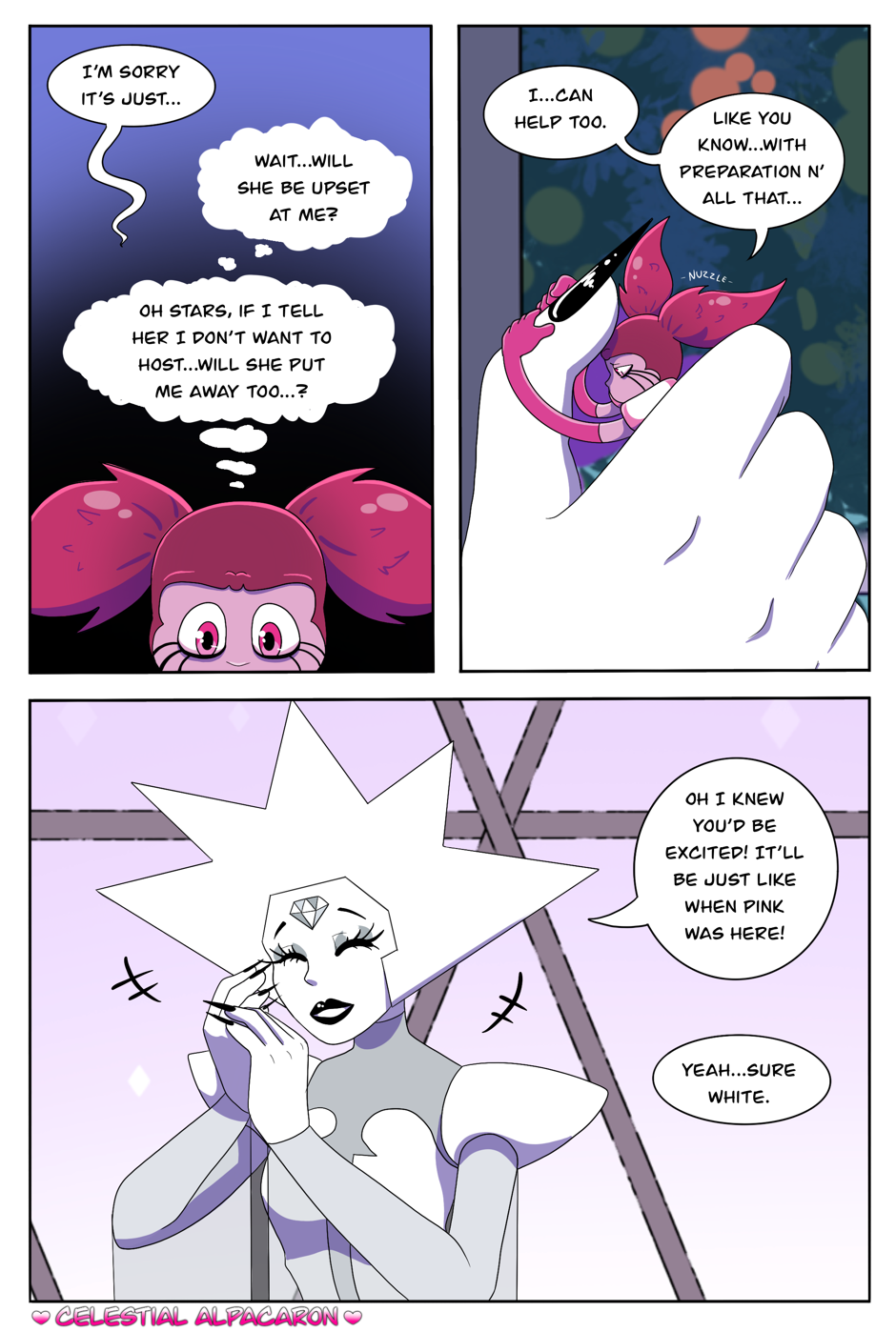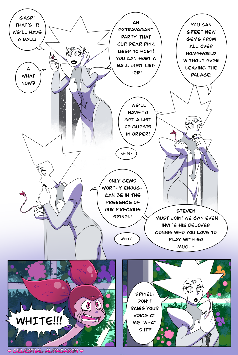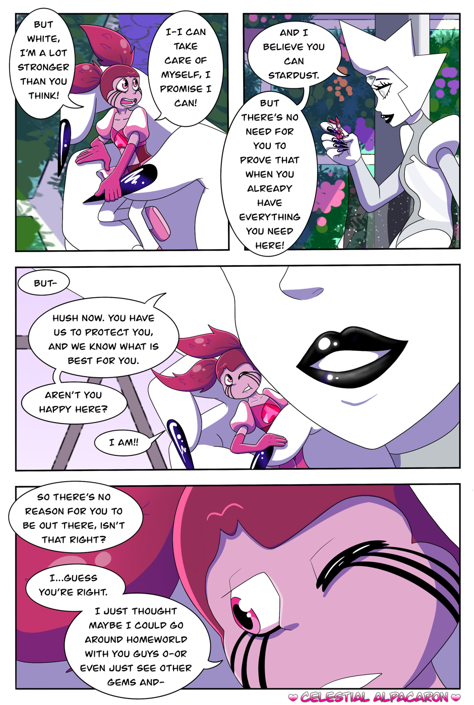 The Diamond Spinel AU comic is an alternative story, which takes place after Steven Universe the Movie and during the time of Steven Universe Future. Everything seemed great when Spinel first arrived at her new home, the Diamonds spoil her rotten and Spinel lived happily ever after with the Diamonds...or so Spinel wants to believe she is. It’s as if the Diamonds went back to their old and terrible habits, treating Spinel just like they had treated Pink. Spinel will have the choice to either give in and be exactly what the Diamonds want, or risk everything to be who she wants to be.