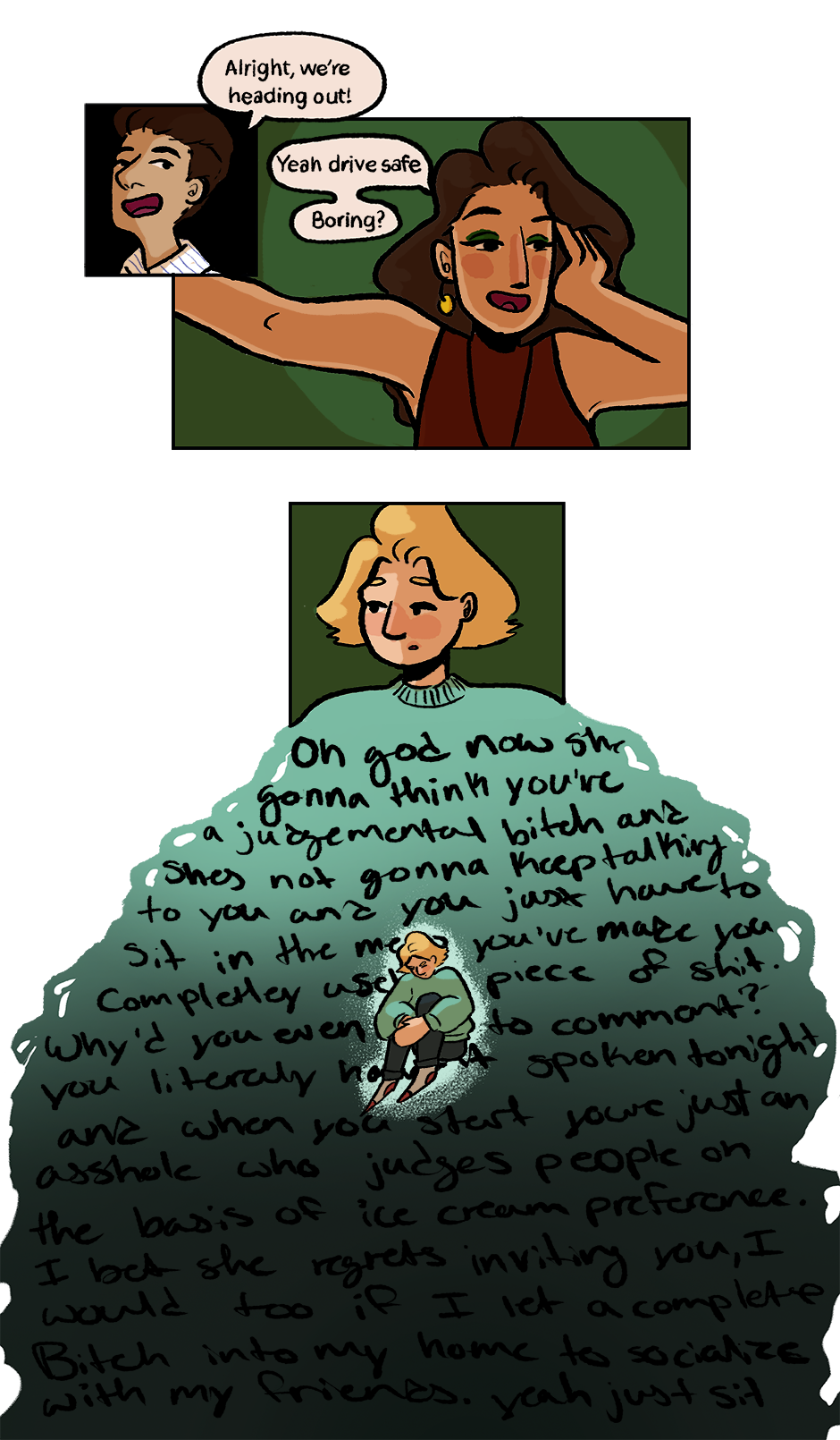 Anxiety is a fun time. Also, have I ever explained how much all of yall mean to me? cause I'm so thankful that each and every one of you has chosen to follow my somewhat poorly drawn comic about anxious lesbians that I started on a whim. Thank you.
