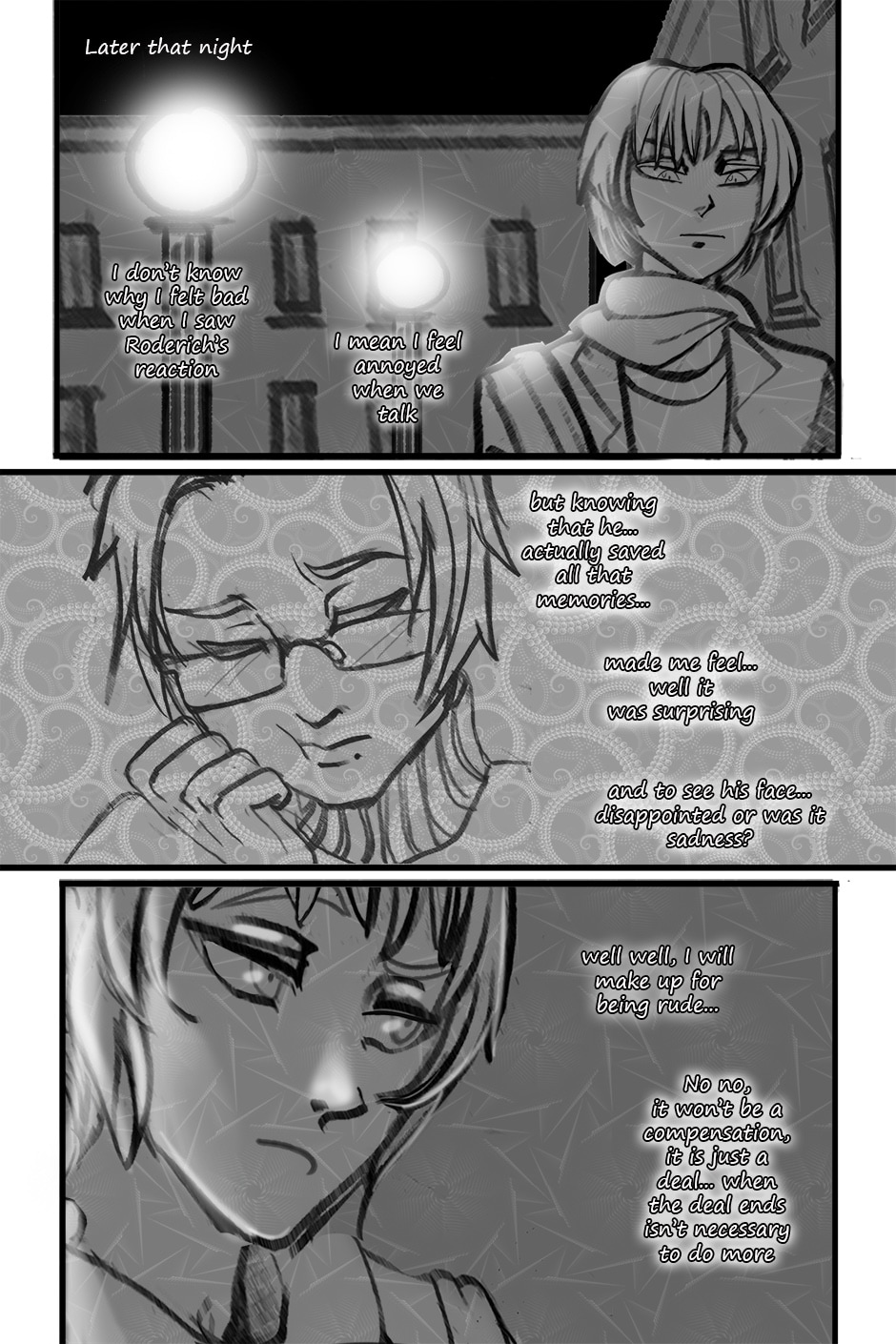 Vash is a university guy who had a little BL romance with his childhood friend, Roderich, a couple of years ago. There happened situations which ones Vash doesn't want to talk about and that's how their friendship ended up. Until he enters to the campus where Roderich is studying. Now he has to fight against the memories and emotions that he has been feeling since when they were young. This is based on some Hetalia characters, but is not necessary to have seen it to understand it.