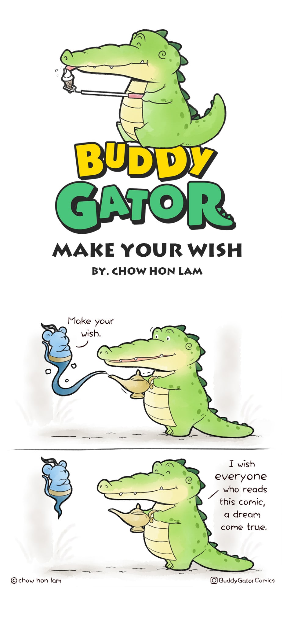 Alligators sometimes give us a scary impression: long mouth, sharp teeth, strong and scary tail. Alligators can be warm and sweet too. In this comic, you will see a different alligator, a warm and friendly alligator. I will call him “Buddy Gator.” Maybe we all need is a buddy like him.