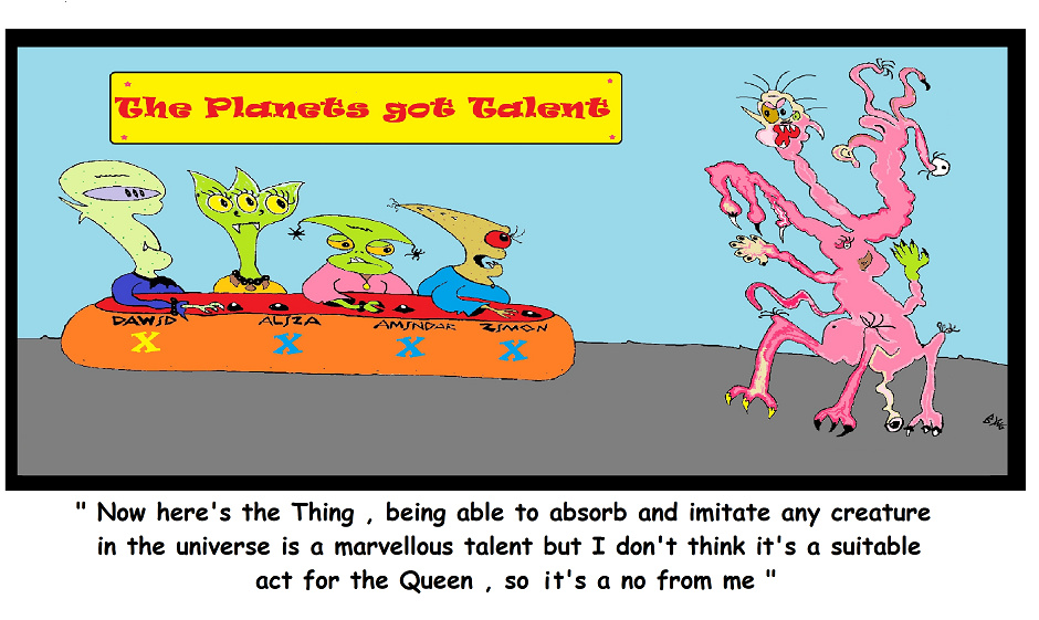 Futuremock about everyday life on other worlds. I have always wondered what life must be like on other planets? Perhaps aliens have the same mundane, everyday domestic issues we have. Yes they would most certainly be physiologically different, more technically advanced perhaps and intelligent? (possibly not especially in my cartoons) but very much like us. Therefore the subject of the feature is taking a humorous surreal look at life as we don’t know it elsewhere in the galaxy which includes all too familiar human subjects such as domestic life & situations, technology, scientific theories, evolution, mythology, science fiction films and literature, television programs, nature , medicine, relationships ,historical figures and so on. The possibilities are endless like the universe we are traveling into with this feature. The alien characters and creatures are also unique to every cartoon.