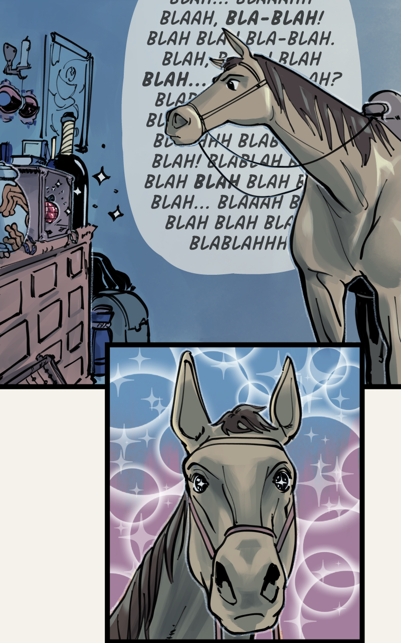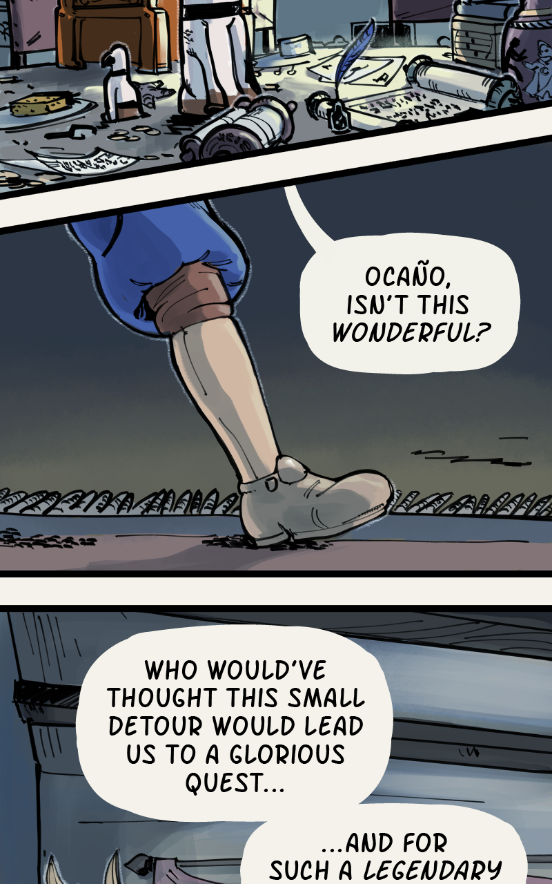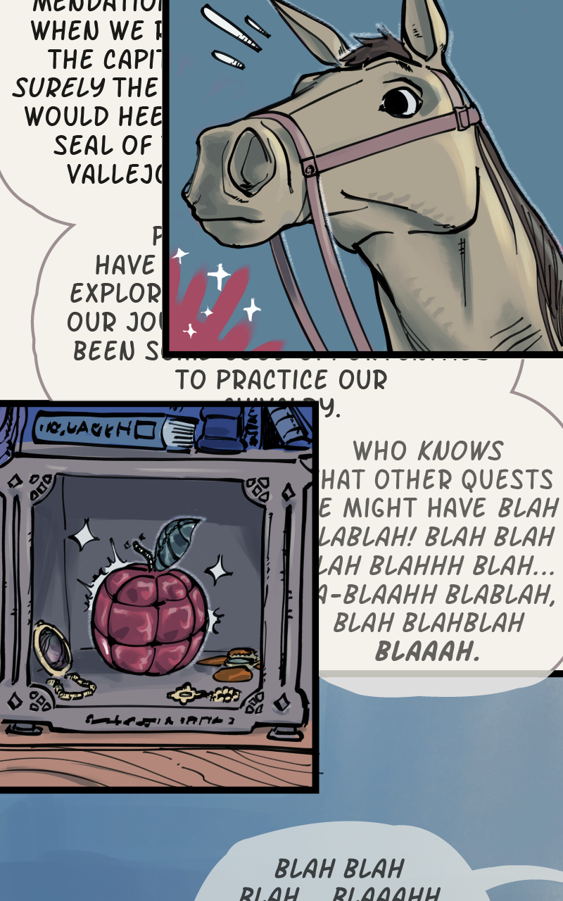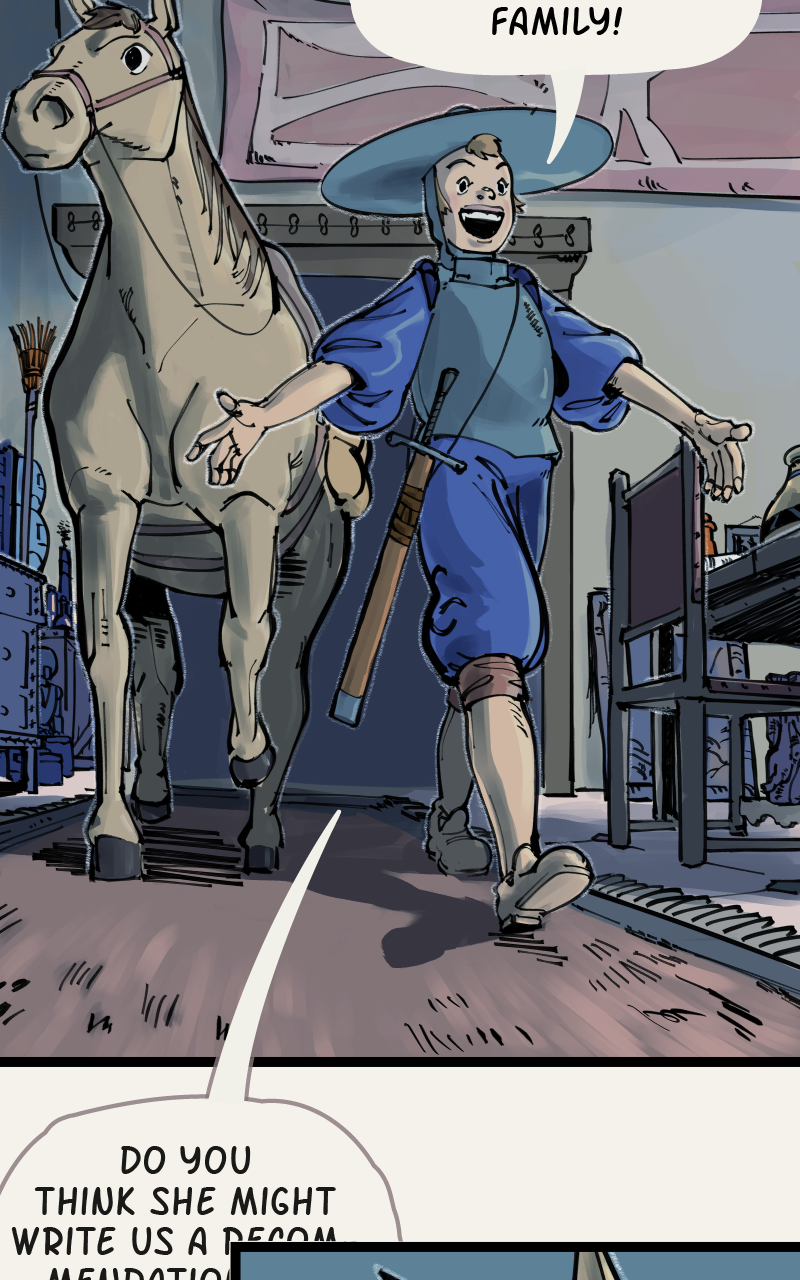 Set in a fantasy world loosely based on medieval Spain, Caballeras is a story about Lilia Vallejo, the last in a family line of adventurers turned magical relic dealers, and Ñona, an idealistic knight who (alongside her trusty steed Ocaño) chivalrously offers to help Lilia respond to a strange burglary at her family estate on the day of an important relic fair.